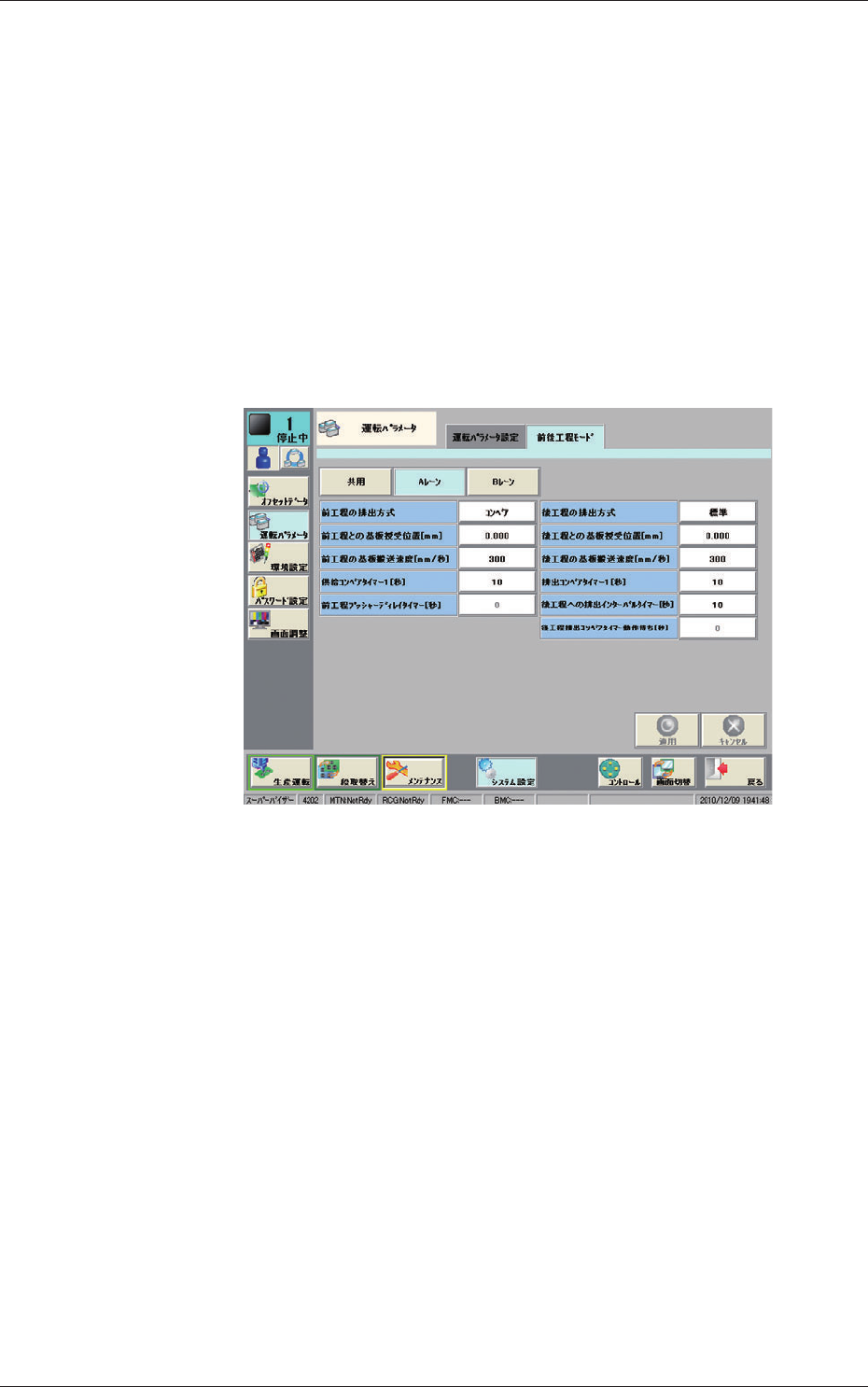 24 OM-1682 12.2 前後工程モード 1 101-001 12.2 前後工程モード 前後工程のモード設定を行います。 デュアル搬送対応以外の説明については、 本体取扱説明書 SIGMA-G5 “3 巻2 章3.2前後工程モード設定”を参照してください。 [1] [2] [1] [2] [3] [4] Fig. 25 前後工程モード • 共用 各レーン共通の前後工程の設定をします。 [1] A レーン同時搬送指定 B…