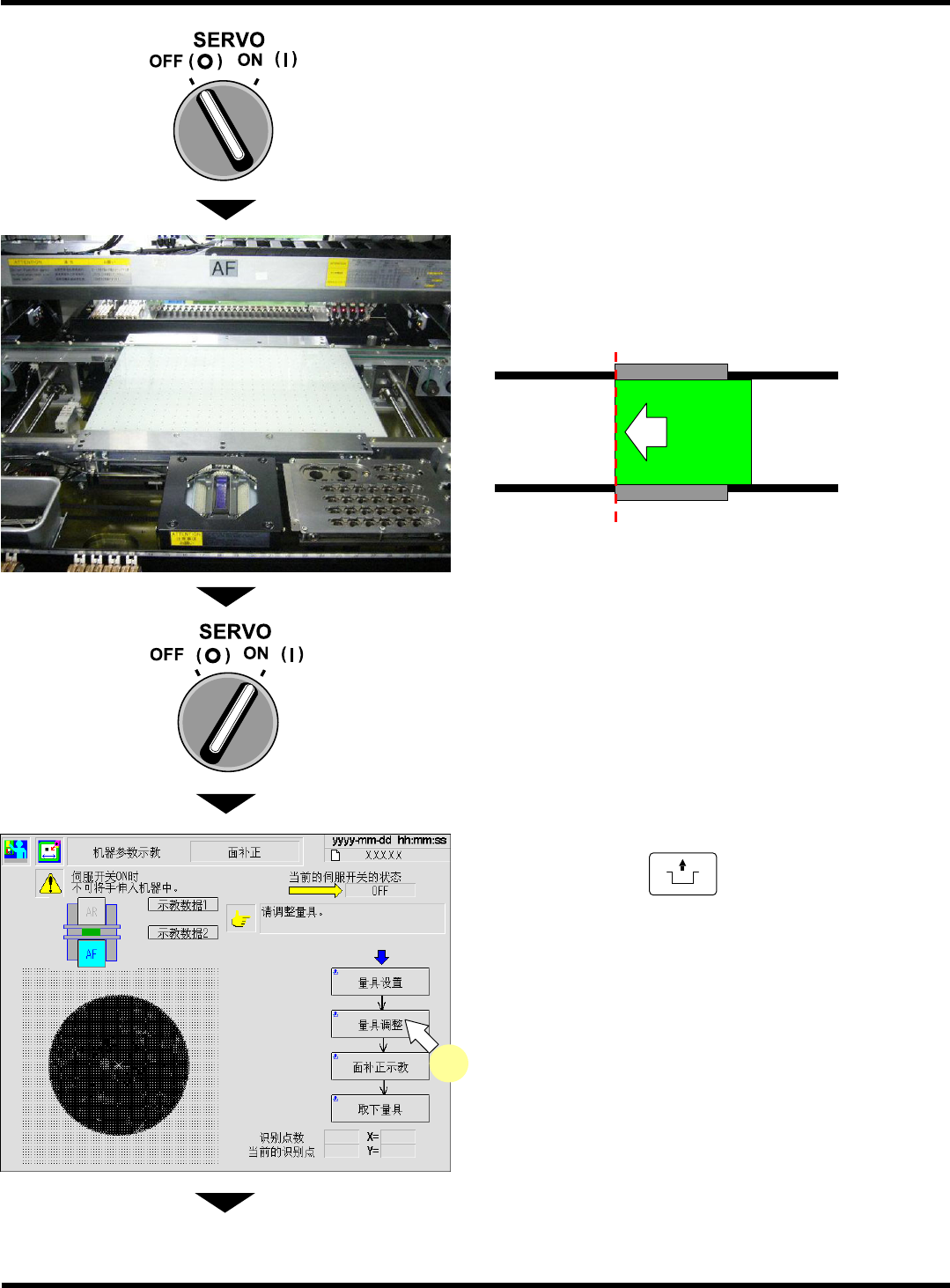 CM101-D 维修手册 2.2 机器参数的示教步 骤 Pa ge 2- 83 2.2.6 面补正 使用工具 面补正量具 D 尺寸 : N610 057764AA M 尺寸 : N610 057763AA 需要时间 20 分钟 ∗ 请根据设备的规格使用 不同的面补正量具。 前期准备 ∗ 进行面补正示教之前, 请确认吸头照相机上未安装 偏光板。 ∗ 卸下所有支撑销。 1. 按 [ 面补正 ] 。 2. 按操作面板的 UNLOCK + …