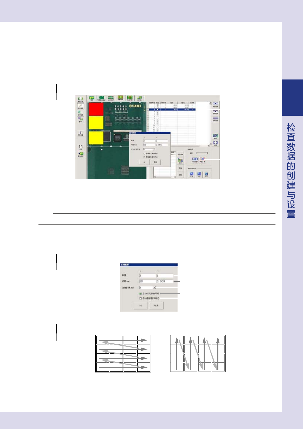 2-30 2 5 按 [OK] 按钮,执行复制。 6 点击视野列表或视野示意图。 显示被复制的视野。 复制后的画面例 复制前 复制后 被复制至指定 的位置 26234-P9-00 6.2.3 视野的自动创建与缩短生产节拍时间 如想在已创建检查对象的数据上自动创建视野,或为缩短检查节拍时间而想优化视野的号码时,可以使用「自动 创建视野」栏的按钮。 自动创建视野按钮 26235-P9-00 全面 自动在基板的整个面上均匀地创建视野。 自动 …