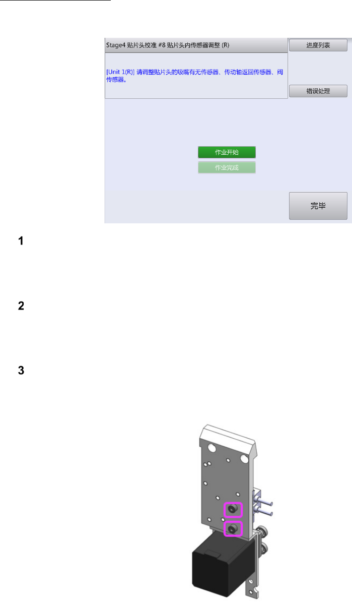 轴软件极限的确认完成后,显示如下画面。进行右侧装置贴片头之吸嘴有无传感器、轴返回传感器、