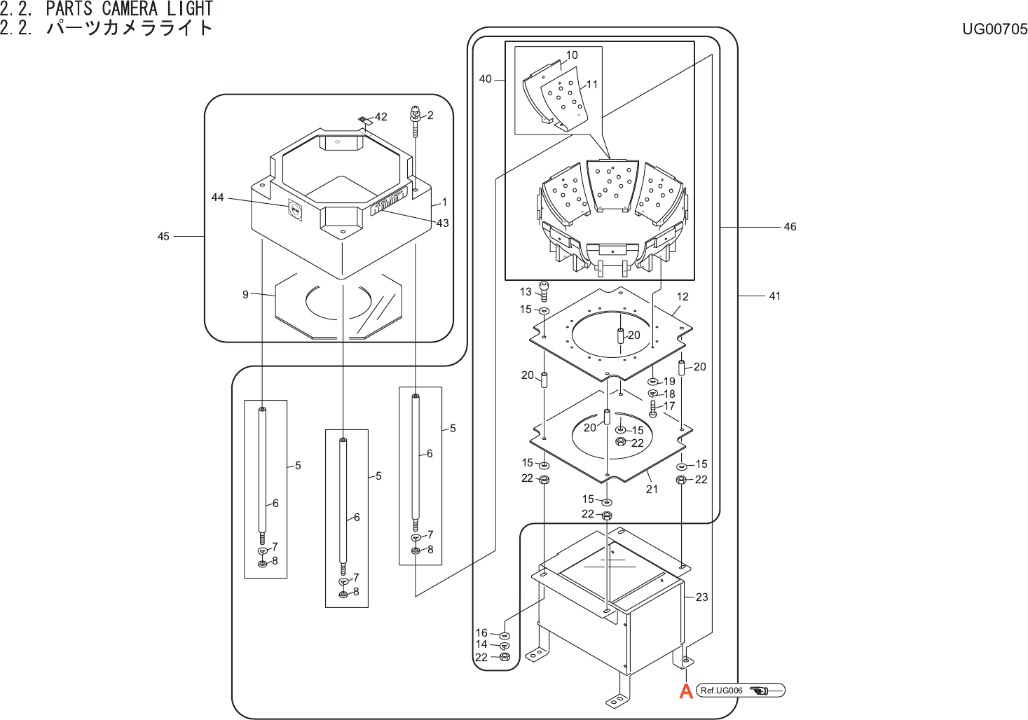 2.2. PARTS CAMERA LIGHT 2.2. パーツカメラライト UG00705 No. Drg.No. & Code No. QTY Description Rating Materials Remarks 番号 図番 & コード番号 個数 品名 規格 材質 備考 1 PB24690 1 COVER カバー FE 2 K51995 4 SCREW, WASHER ASS'Y 小ネジ 座金組込み …