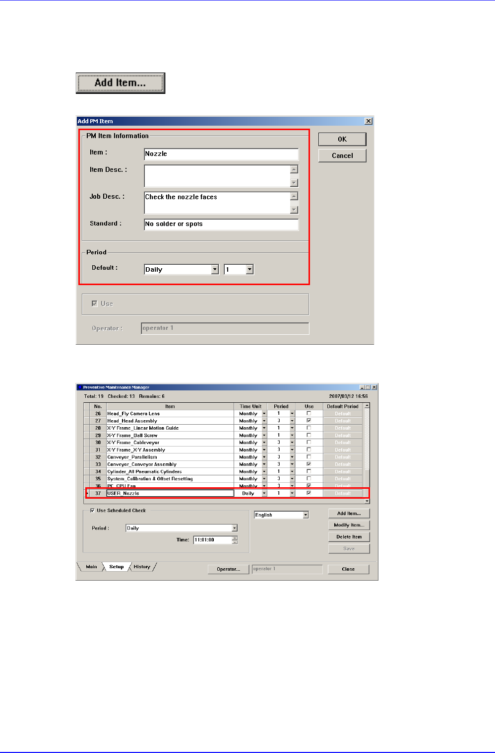 在‘Add PM Item’对话框中输入要增加的项目后,设置检查周期。