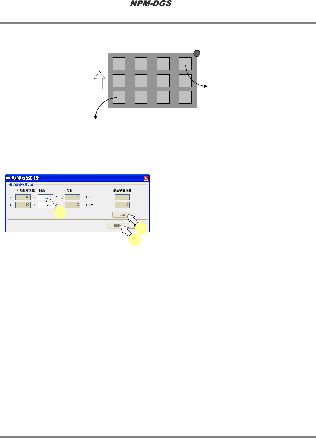程序手册 6.5 添加新的元件 EJS9AC-MB-06P-18 Page 6-81 n 托盘元件空缺指定 在 < 托盘元件空缺位置 > 画面上,可通过托盘元件配置 示意图指定不存在元件的位置。 1 指定托盘的配置模式。 · 当存在开始行为 1 、开始列为 1 的元件时,请 选择 [ 检查点 1 (0,0)]; 当在这个部位上不存在 元件时,请指定 [ 检查点 2 (0,0)] 。 2 指定没有元件或有元件的位置。 3 点击…