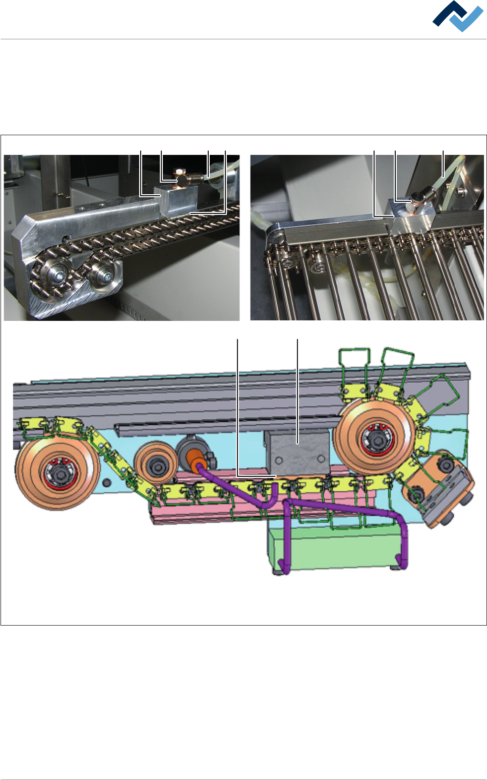 Gli applicatori (1) si trovano al di sopra delle catene del supporto centrale e del
