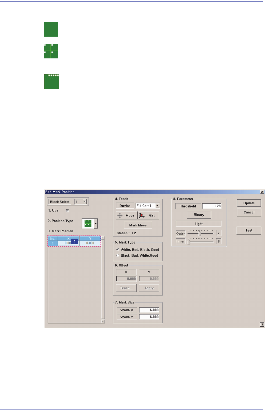 6-28 Samsung Component Place r SM471 Administrator's Guide 그림 6.6 “ Bad Mark Position ” 대화상자 (Position Type 이 “ None ”인 상태 ) <Block Select> 콤보박스 멀티 PCB 인 경우 “보드 정의 ” 대화상자에서 선택한 모델이 자동으로 선택되며 , 해당 콤보박 스는 비활…