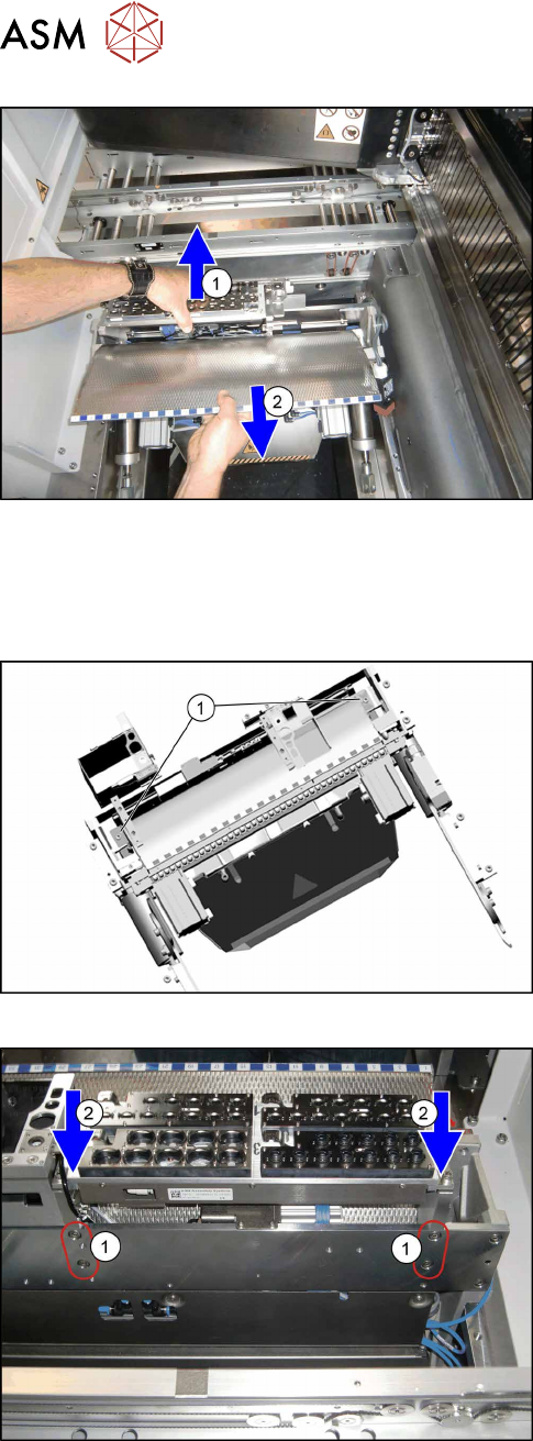 ► Carefully lift the nozzle changer carrier(1) and