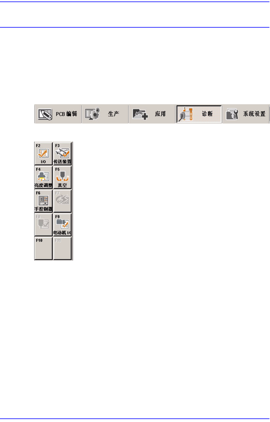 诊断(Diagnosis)菜单由I/O(输入/输出), 传送装置(Conveyor), 灯光(Light), 真