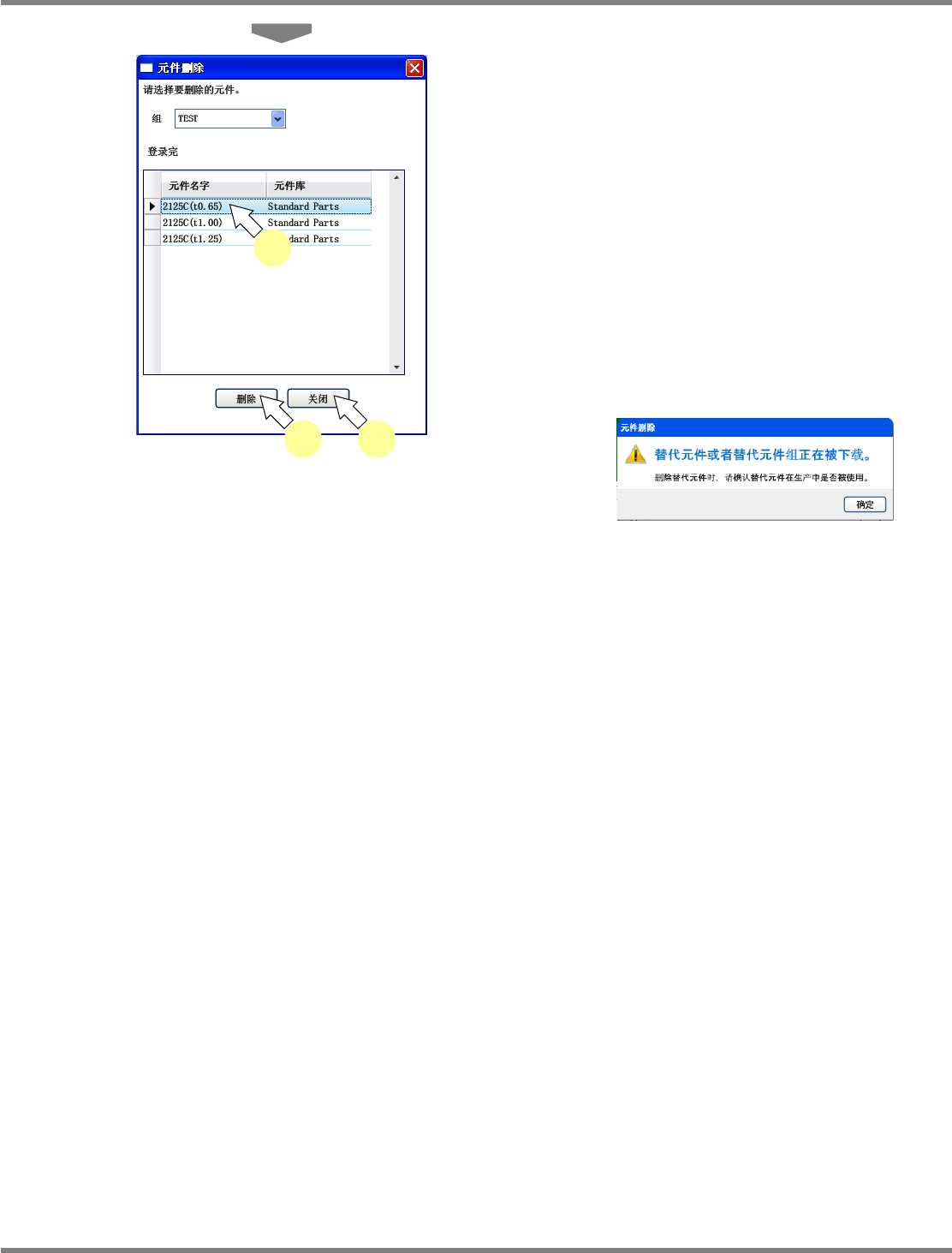 NPM-DGS 程序手册 6.8 代替元件的设定 Page 6-226 EJS9AC-MB-06P-28 在元件编辑器画面上删除设定 1 点击代替元件按钮 , 或者点击菜 单的 [ 高级 ] [ 替代元件 ] 。 显示出 < 元件删除 > 画面。 2 点击 [ 是 ] 。 当在下载数据中使用删除了替代元件 的组时, 将显示以下对话框。 ( 只在已下载完毕的生产线 元件上显示。 ) 当删除了组内的全部替代元…