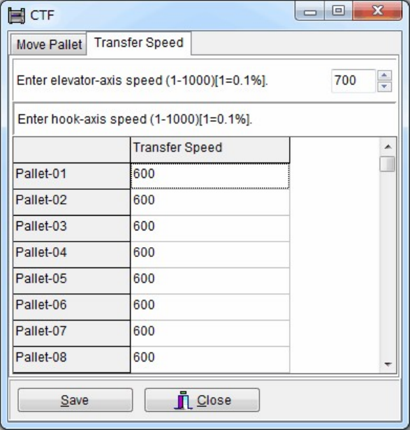 Allows you to set each pallet transfer speed and the elevator speed for job run (1-1000,