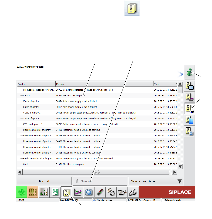 5 Задачи на машине Рук оводство по эк сплуатации SIPLACE SX1/SX2 5.6 Информация об аварийных сигналах и интерактивная справка Начиная с версии SR.710.0 Издание 12/2016 244 5.6.1 Про смо тр инфор мации о посл еднем аварий…