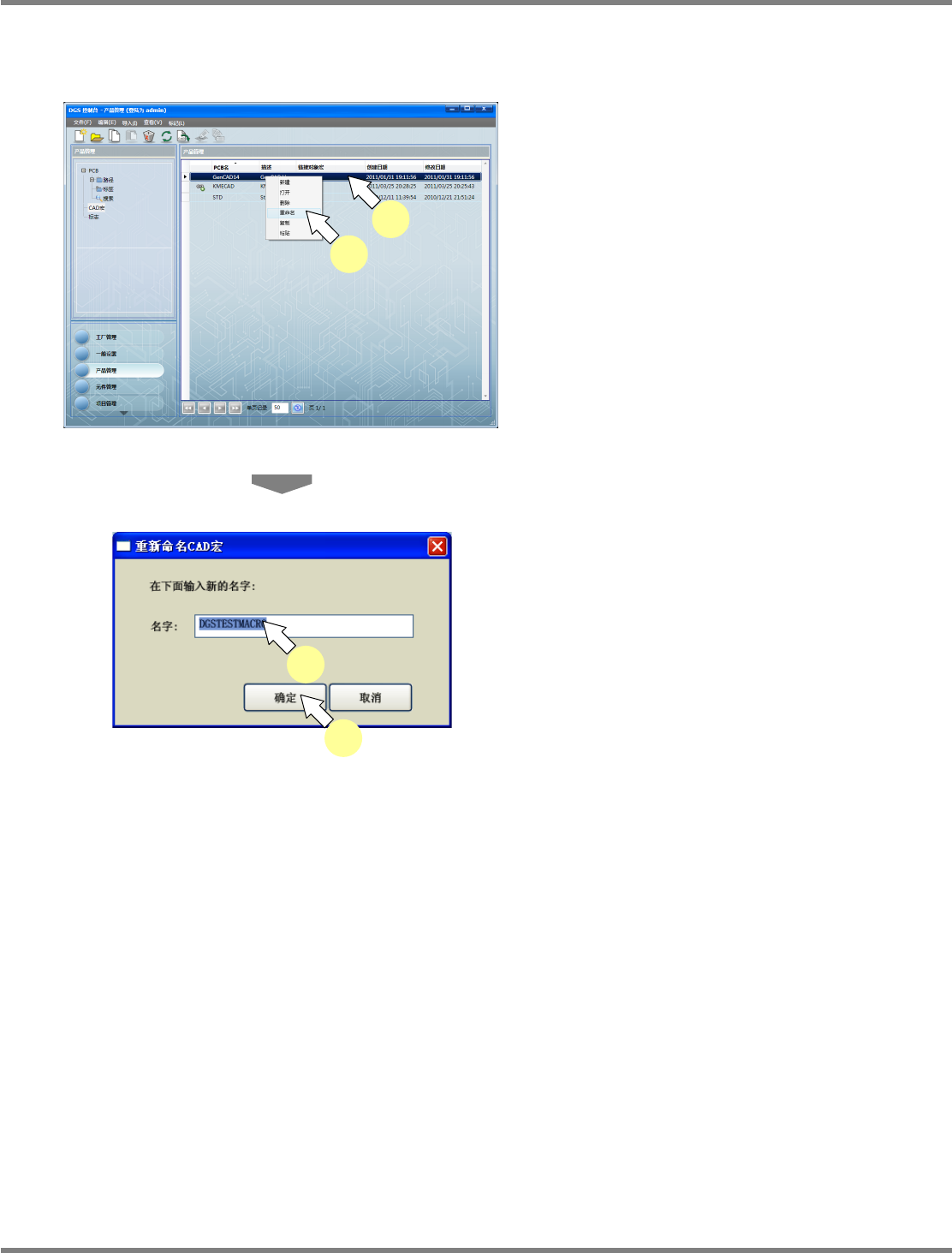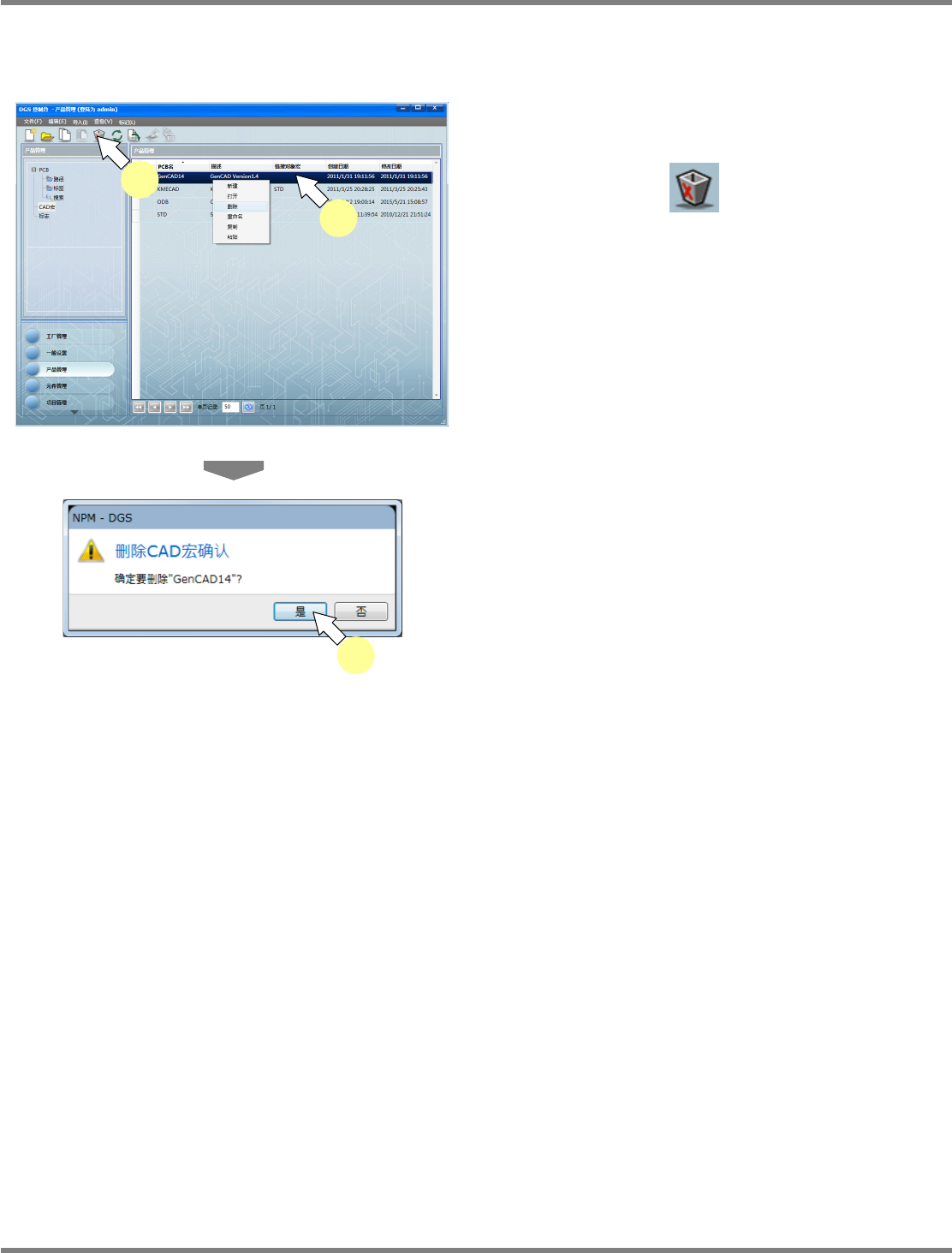 NPM-DGS 程序手册 5.2 CAD 宏的定义 Page 5-86 EJS9AC-MB-05P-25 5.2.5 CAD 宏的删除 对已登录的 CAD 宏进行删除。 1 在 PCB 一览中选择要删除的 CAD 宏。 2 选择工具栏的 ( 删除 ) , 或者菜单 栏的 [ 编辑 ] [ 删除 ] ,或者在右击菜单 中选择 [ 删除 ] 。 显示出确认对话框。 不能删除与脚本定义 CAD 宏相链接的用户定 义 CAD 宏。请…