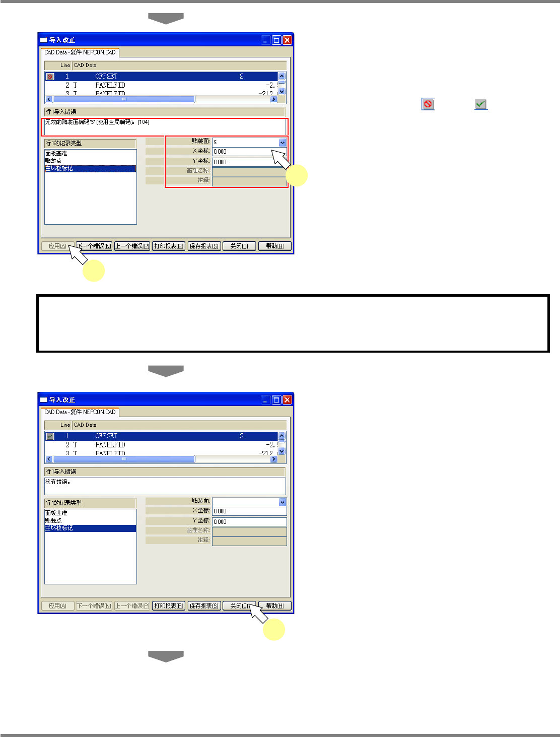 NPM-DGS 程序手册 5.3 CAD/BOM 文件的导入 EJS9AC-MB-05P-25 Page 5-91 3 确认,修正获取错误的原因。 4 点击 [ 应用 ] ,确认错误是否被修正。 如果错误被修正, 将变成 。 存在其它的错误原因时, 点击 [ 下一个错误 ] ,进 行错误修正。 要求 在此进行的修正是暂时的修正。 为使变更有效, 必须在 [CAD 系统编辑器 ] 的 [ 文件格式 ] 窗口,对变更的 CAD 系统…