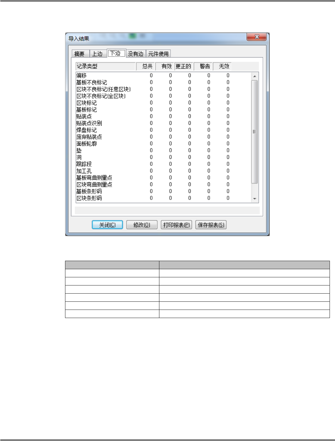 NPM-DGS 程序手册 5.3 CAD/BOM 文件的导入 Page 5-96 EJS9AC-MB-05P-25 ④ 基板面无指定标签 只显示基板面无指定的记录。 显示项目 项目 说明 ‘ 记录类型 ’ 显示导入中的 CAD 宏的所有记录类型。 ‘ 总共 ’ 显示各记录类型当中的记录的合计。 ‘ 有效 ’ 显示各记录类型当中的有效记录的合 计。 ‘ 更正的 ’ 显示各记录类型当中的被正确修改的 记录的合计。 ‘ 警告 ’ 显示各记…