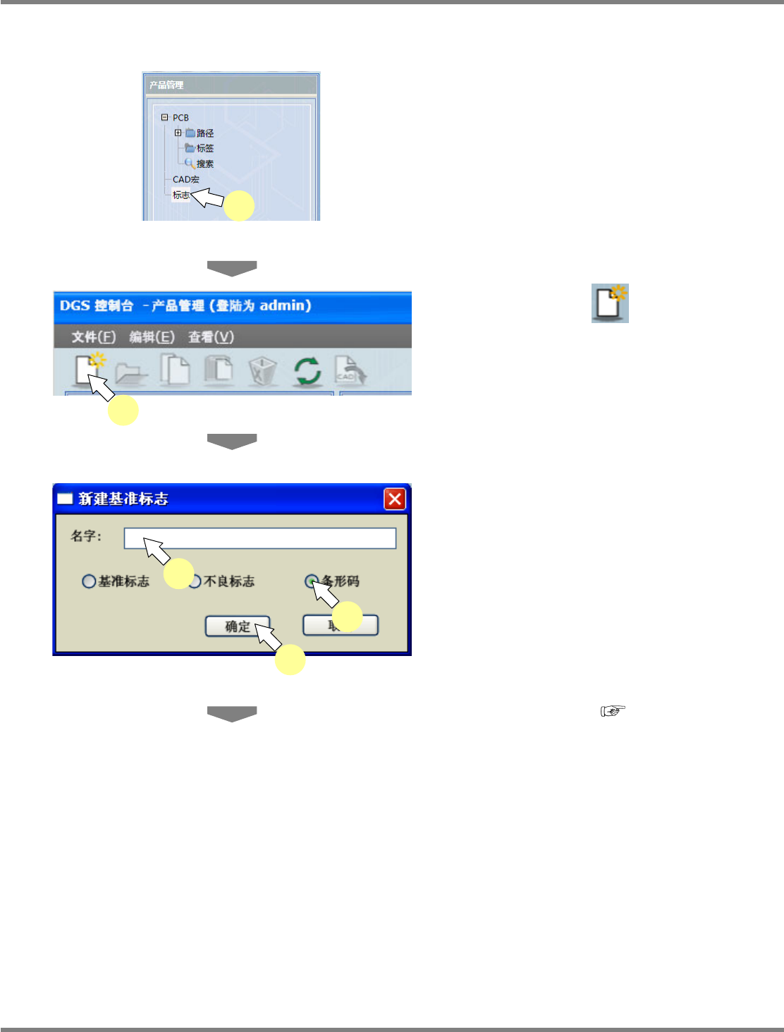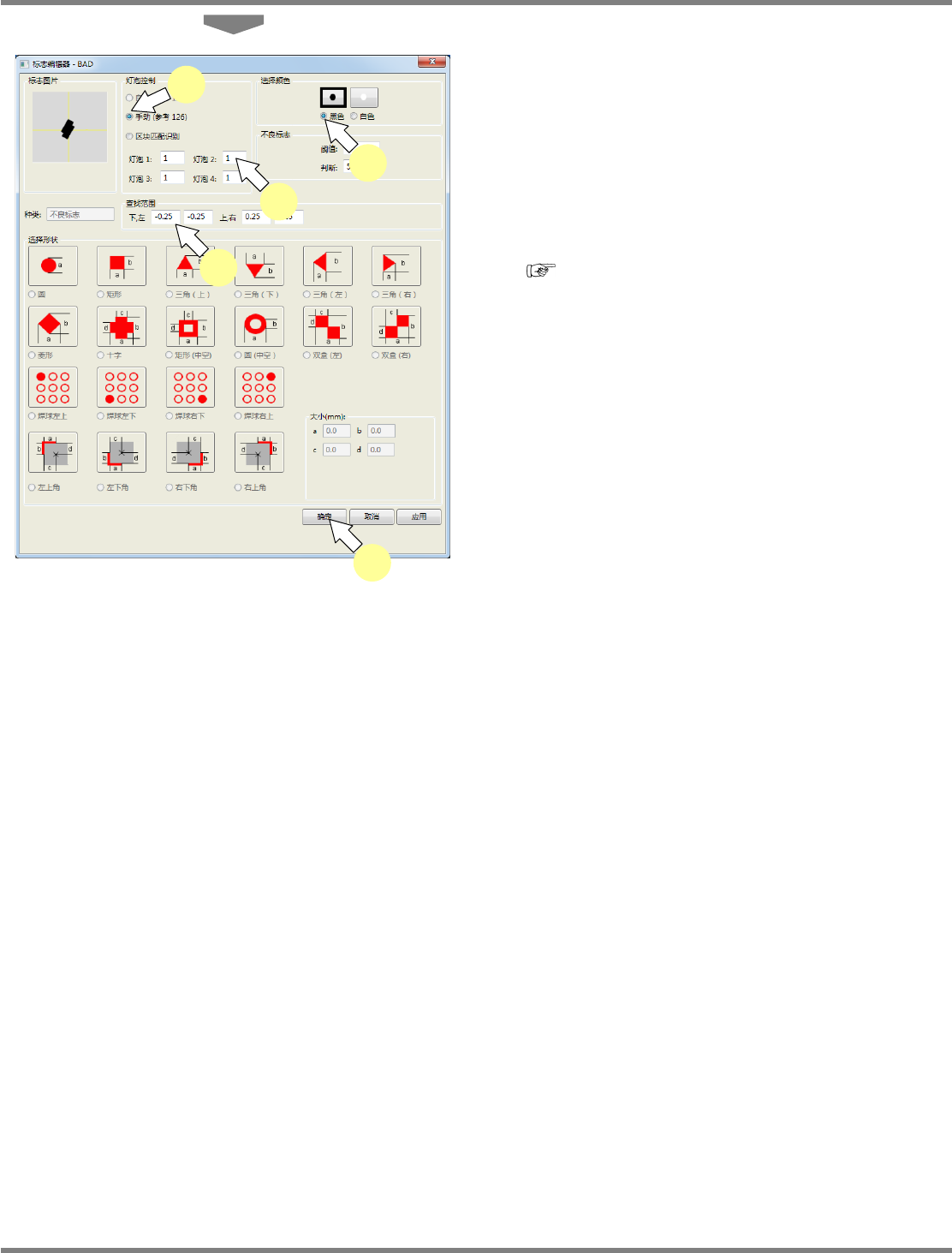 NPM-DGS 程序手册 5.7 标记的设定 Page 5-128 EJS9AC-MB-05P-25 6 在 ‘ 灯泡控制 ’ 项目下选择不良标记的 识别模式。 7 输入照明值。 不良标记时,识别模式已被固定为手 动。在通 常状态下,在设备上进行照明值的示 教,然后 决定。 ( 详细内容,请参照设备使用说明书。 ) 8 在 ‘ 选择颜色 ’ 中选择标记的颜色。 标记的颜色比周边的颜色浓时,请选 择黑色, 比周边的颜色淡时,请选择…