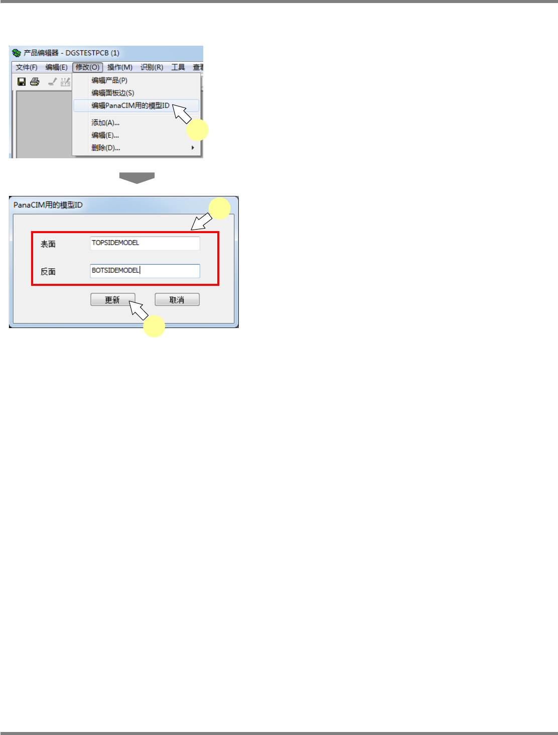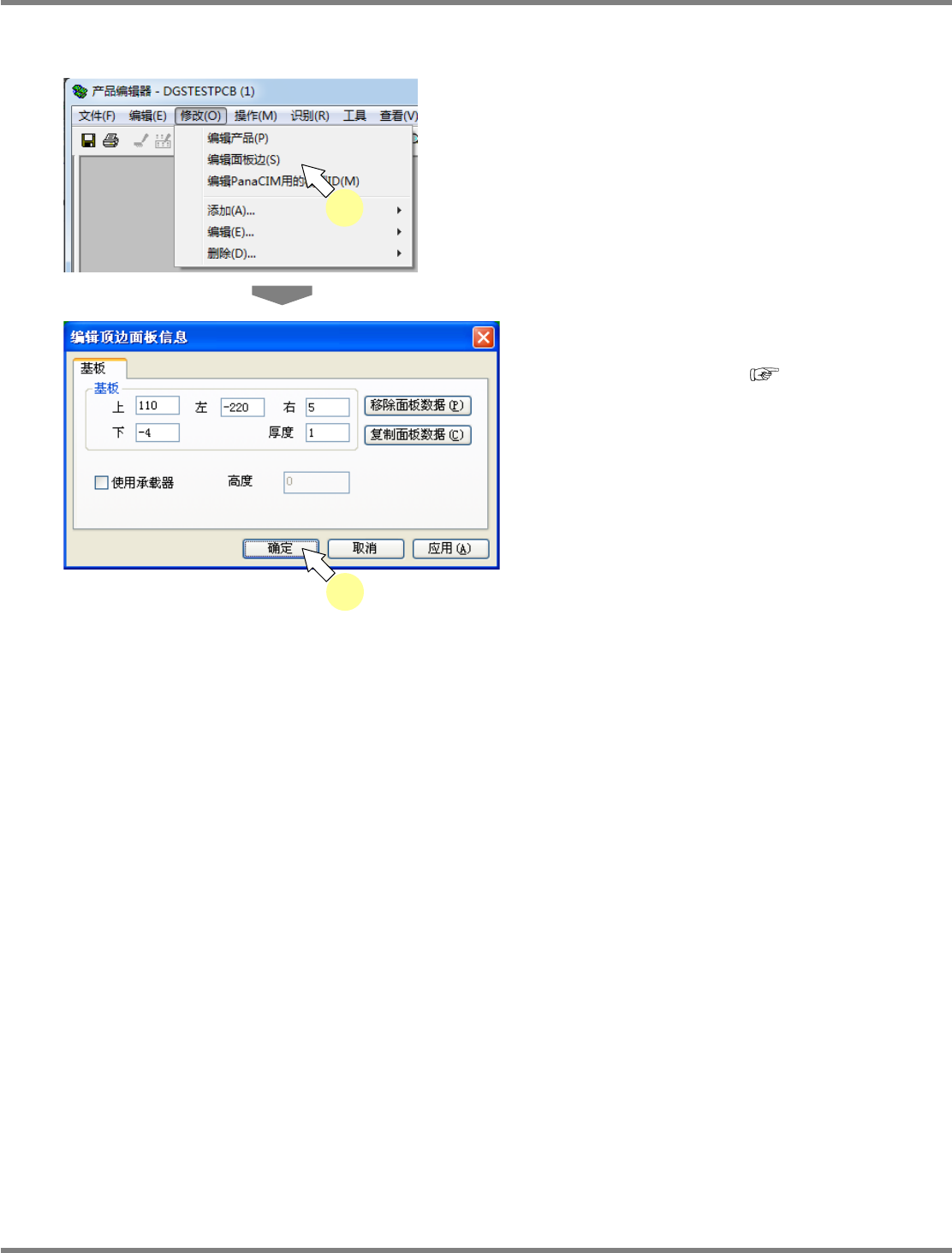 NPM-DGS 程序手册 5.8 PCB 编辑 EJS9AC-MB-05P-25 Page 5-155 编辑基板属性 1 选择菜单栏的 [ 修改 ] [ 编辑面板边 ] , 或者鼠标光标位于基板上时在右击菜 单中选择 [ 编辑面板边 ] , 或者双击基板。 将会显示 < 编辑顶边面板信息 > 画面。 2 进行标签的编辑。 < 基板数据复制 > 画面 : ‘5.8.1 基板信息 ’ ‘ 基板标签…