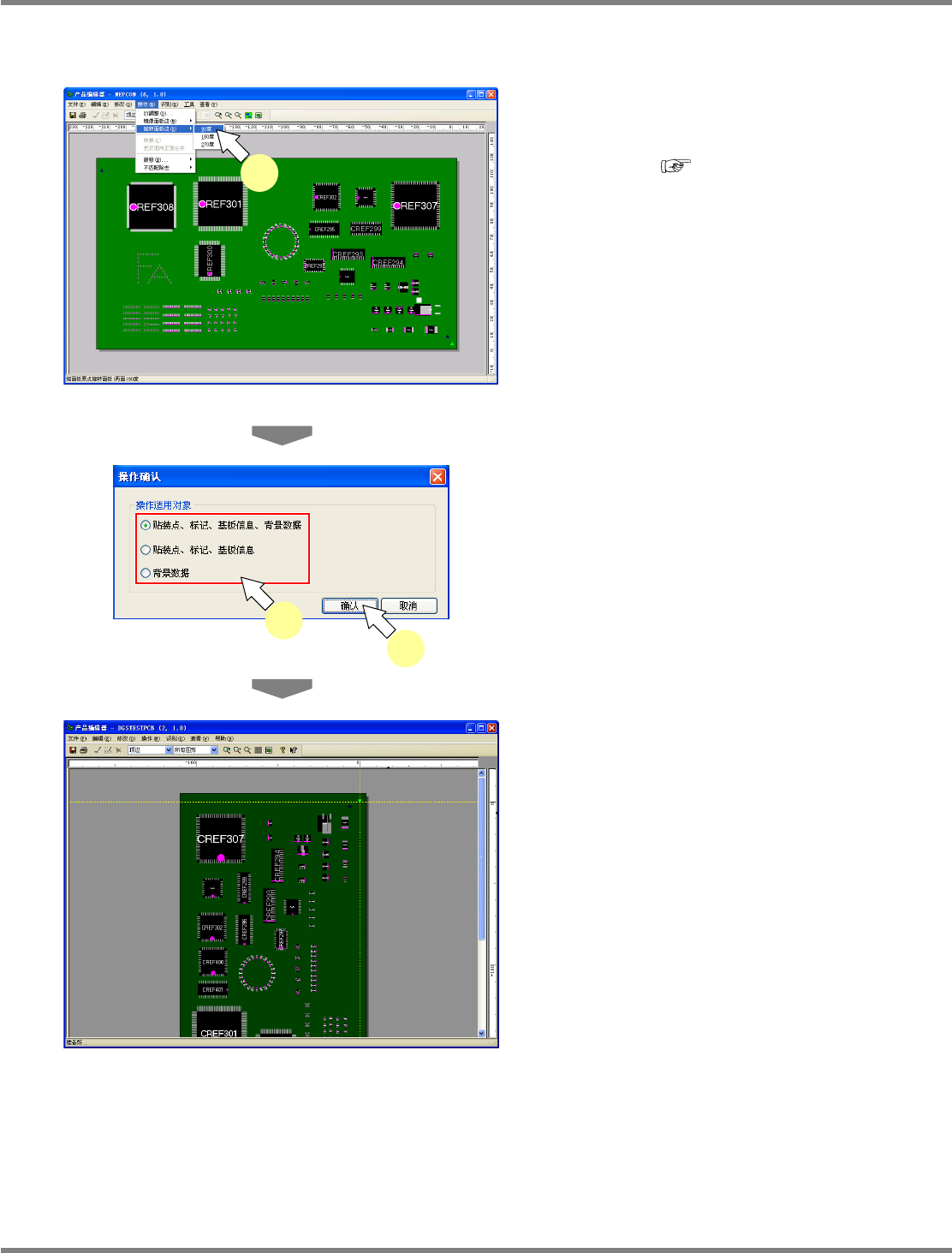 NPM-DGS 程序手册 5.8 PCB 编辑 EJS9AC-MB-05P-25 Page 5-167 基板的旋转 1 选择菜单栏的 [ 操作 ] [ 旋转面板边 ] , 选择使基板旋转的角度。 旋转方向 : ‘5.8 PCB 编辑 ’ ‘ PCB 编辑 器 ’ 当在 PCB 中存在背景数据时,将显示 < 操作确 认 > 画面。 2 选择适用旋转的数据。 3 点击 [ 确认 ] 。 显示出按指定的角度…