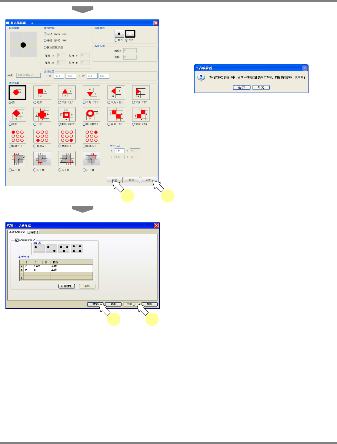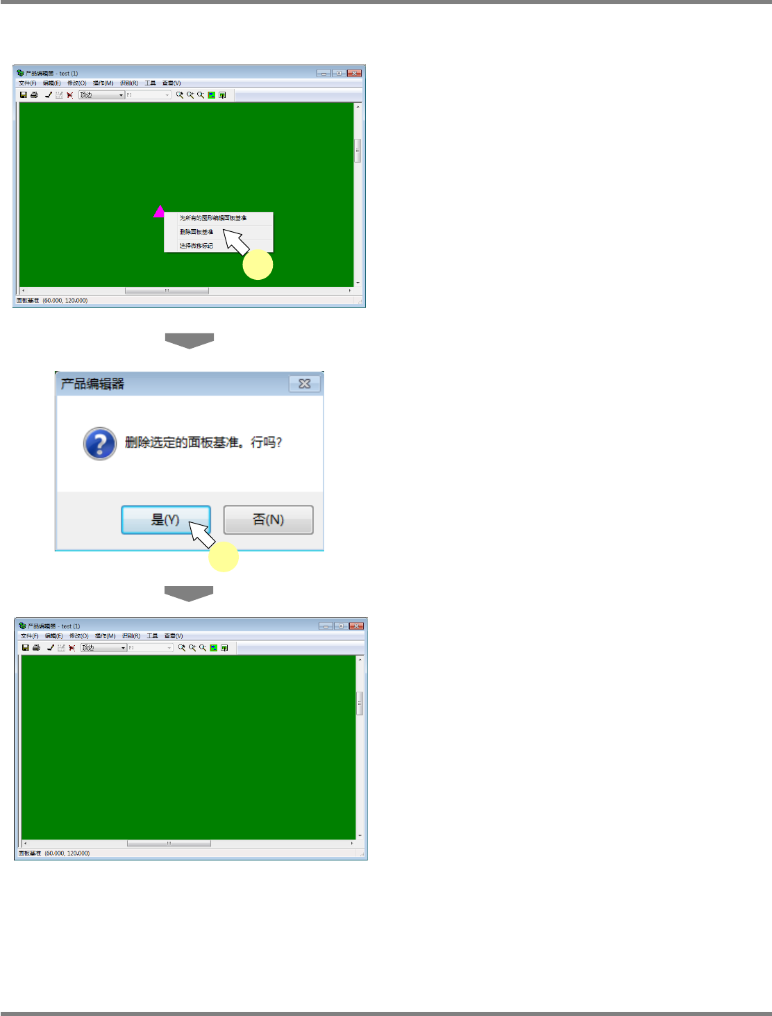 NPM-DGS 程序手册 5.8 PCB 编辑 EJS9AC-MB-05P-25 Page 5-177 ③ 选择删除面板识别基准 1 选择想要删除的面板基准后, 点击右击 菜单的 [ 删除面板基准 ] 。 2 显示出确认对话框,点击 [ 是 ] 。 将删除所选择的删除识别基准,基准 数量会减 少一个。 3 需要将变更反映至 PCB 时, 请点击 [ 确 定 ] 或 [ 应用 ] 。 Project050802S-1 30C00 1 …