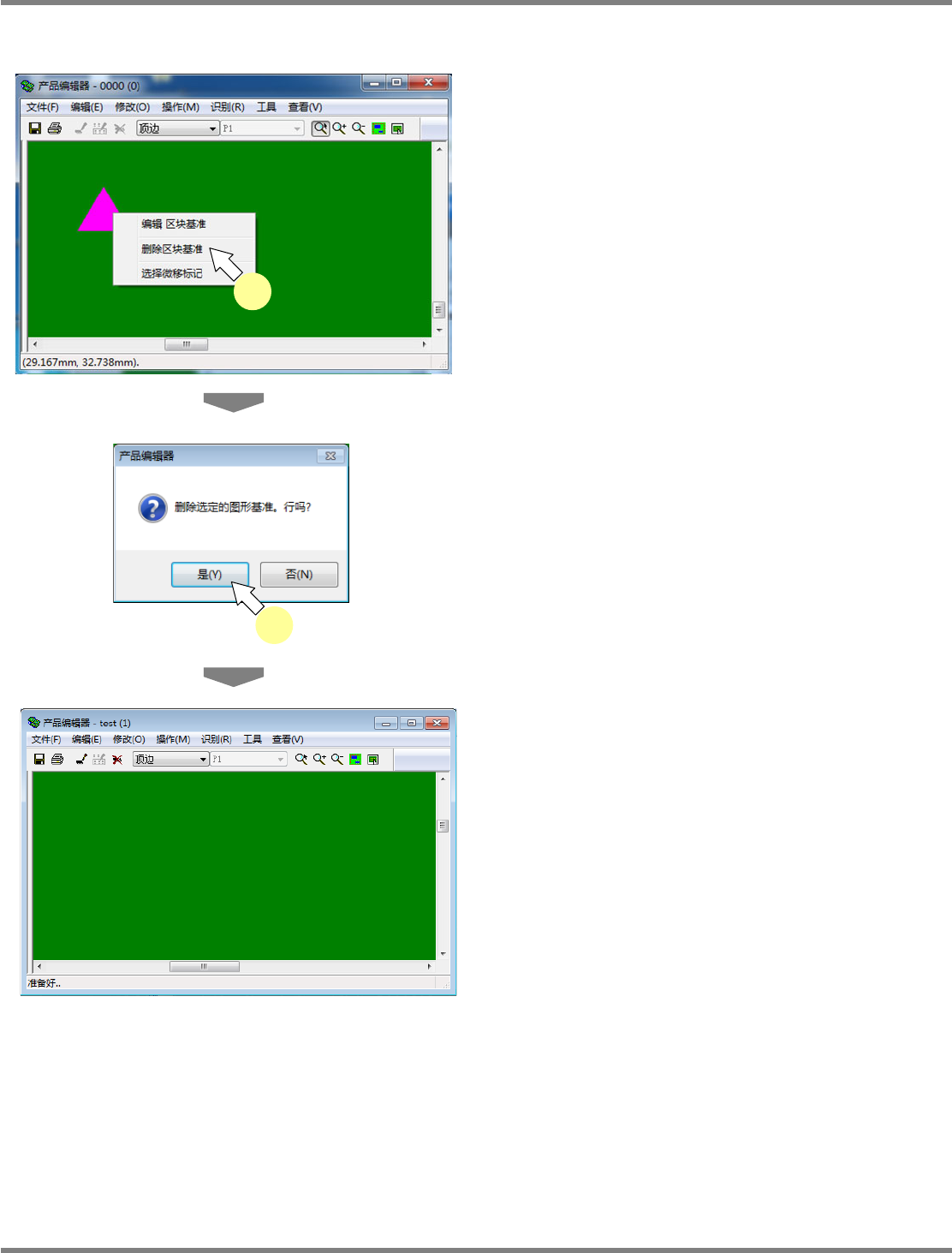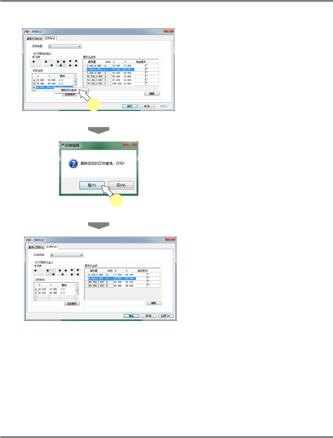 NPM-DGS 程序手册 5.8 PCB 编辑 Page 5-188 EJS9AC-MB-05P-25 ④ 在产品编辑器上选择删除区块基准 1 在产品编辑器上选择想要删除的区块 基准后,点击右击菜单的 [ 删除区块基 准 ] 。 2 显示出确认对话框,点击 [ 是 ] 。 将从产品编辑器上删除所选择的区块 基准。 Project050802S-1 36C01 2 PProject050802S- 139C00 Project0508…