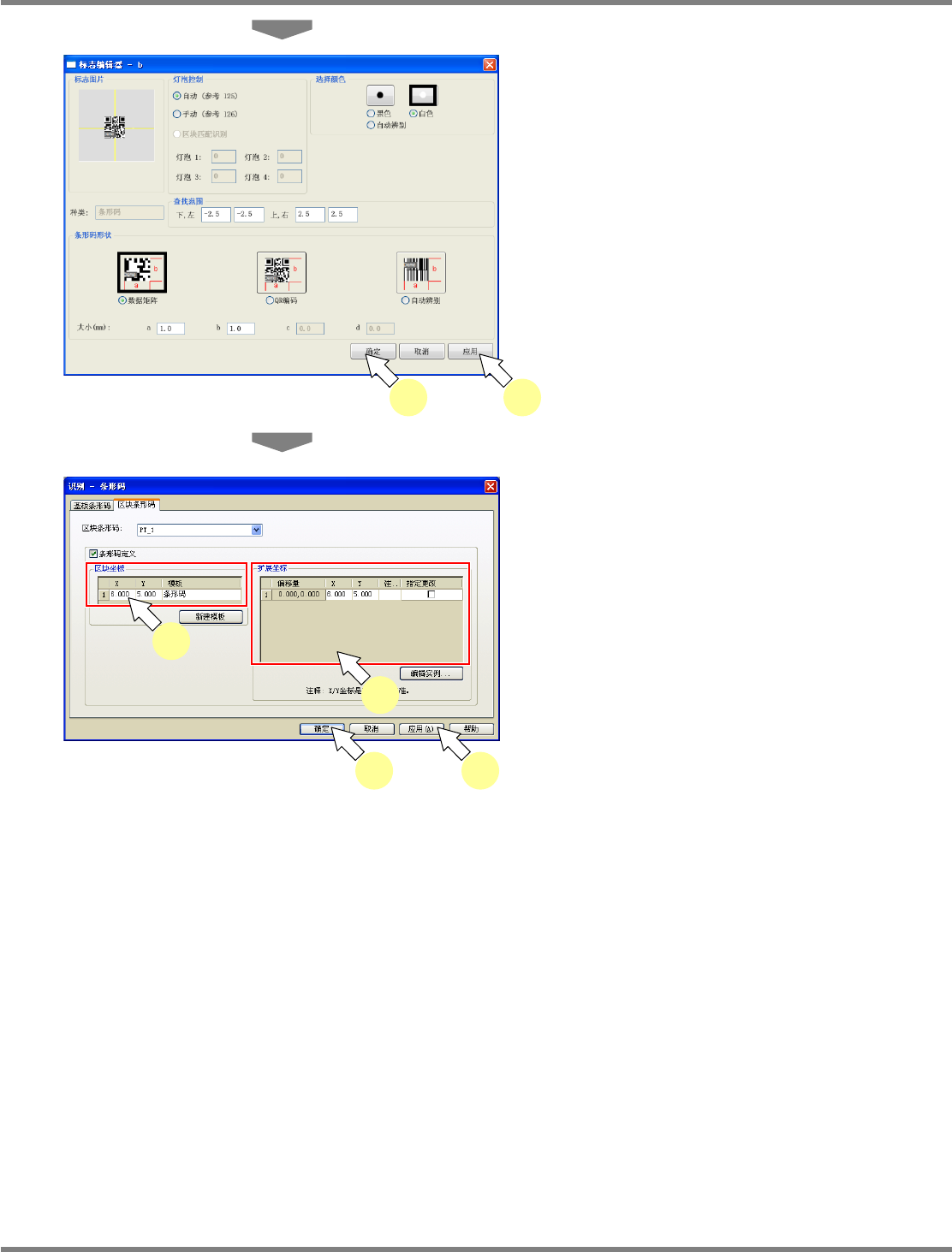 NPM-DGS 程序手册 5.8 PCB 编辑 Page 5-220 EJS9AC-MB-05P-25 ① 添加新建的区块条形码 1 选择菜单栏的 [ 识别 ] [ 条形码 ] 。 显示出 < 识别 – 条形码 > 画面。 2 选择 [ 区块条形码 ] 标签。 3 选择要添加区块条形码的区块类型。 4 在 ‘ 条形码定义 ’ 栏中打勾。 5 在重新登录标记时,点击 [ 新建模板 ] 。 显示出 < 新建基准…
