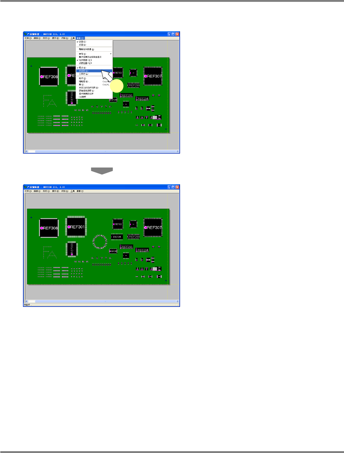 NPM-DGS 程序手册 5.8 PCB 编辑 Page 5-234 EJS9AC-MB-05P-25 原点的显示 1 选择菜单栏的 [ 查看 ] [ 原点 ] 。 显示出基板的原点、 X 轴、 Y 轴。 Project050802S-1 00C02 1 Project050802S-1 01C02