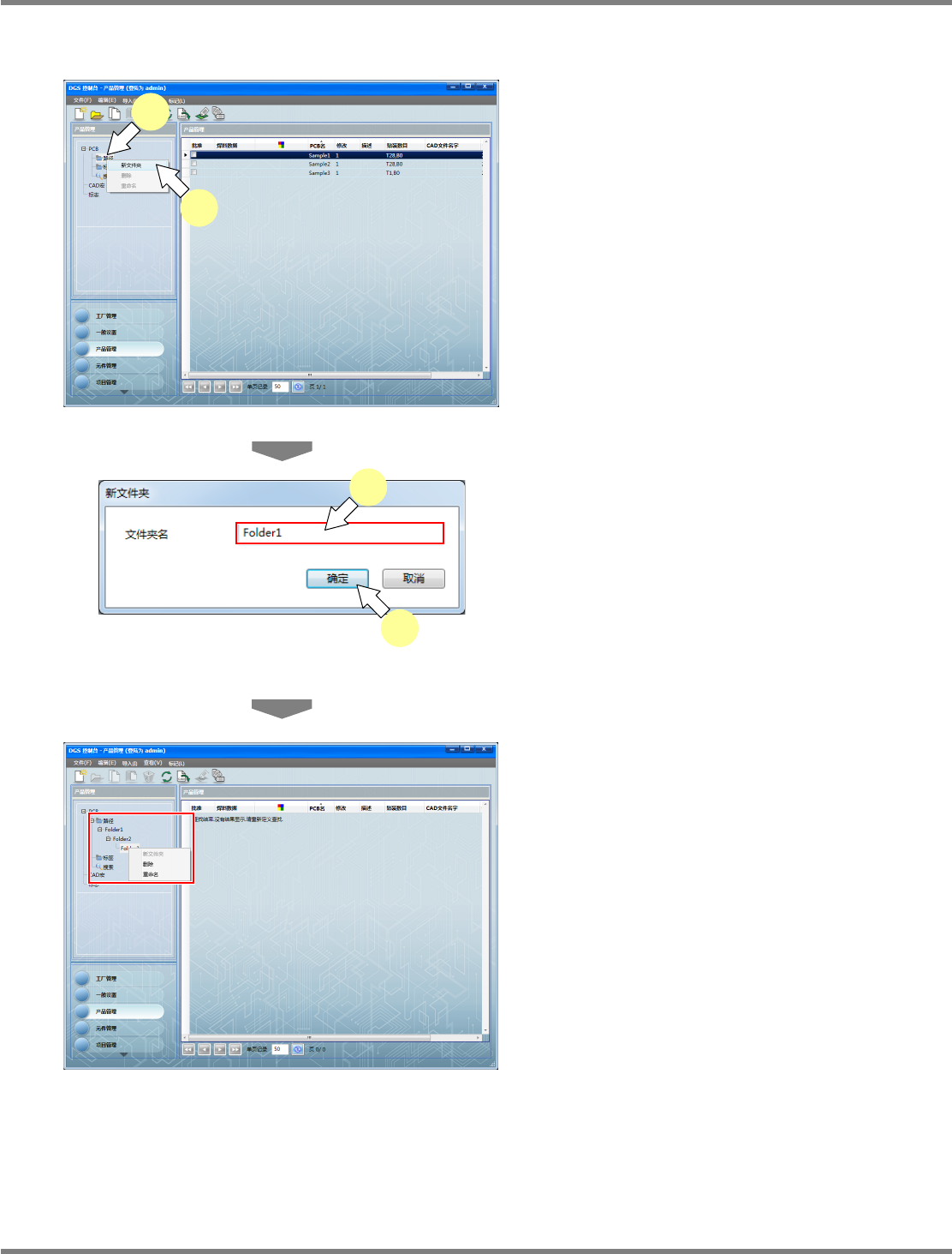 NPM-DGS 程序手册 5.1 概要 Page 5-8 EJS9AC-MB-05P-25 5.1.4 删除文件夹 1 选择需要删除的文件夹。 2 从右击菜单中选择 [ 删除 ] 。 3 将显示文件夹删除确认信息, 确定删除 时点击 [ 是 ] 。 将删除文件夹。 位于所删除文件夹内的 PCB 或文件夹都被删 除。 当在删除的文件夹中存在编辑中的 PCB 时, 无 法删除。需要删除时,请关闭 PCB 编辑器。 Project…