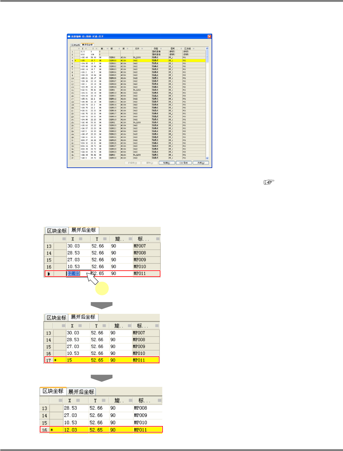 如果坐标变更为与展开后坐标不同的坐标,行的颜色转为黄色す。同时,