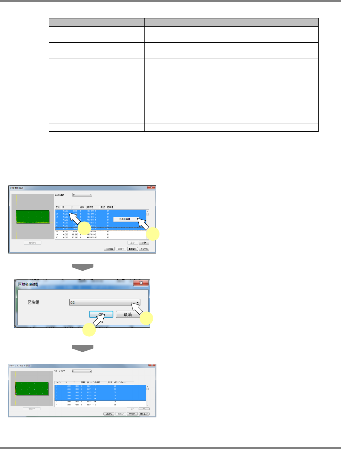 NPM-DGS 程序手册 5.8 PCB 编辑 EJS9AC-MB-05P-25 Page 5-293 5.8.8 区块组 所谓组的概念即是在基板与区块间的 中间的值。 使用区块组识别功能时,如下项目可 期待获得改善。 • 可试图识别时间的缩短。 ( 进行区块识别时,如果区块数目多,识 别时间会更长。 ) • 可提高补正精度。 ( 基板形状较细长的情况下,如果仅进行 基板识别,精度可能不太稳 定。 ) 如下图所示,区块组识别对有多数区 …