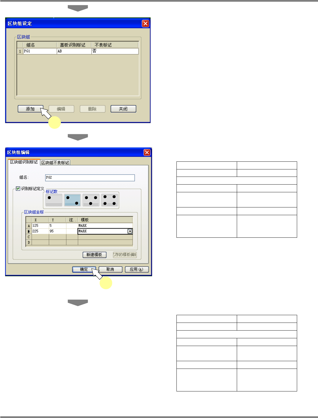 NPM-DGS 程序手册 5.8 PCB 编辑 Page 5-296 EJS9AC-MB-05P-25 4 点击 [ 添加 ] 。 显示出 < 区块组编辑 > 画面。 5 输入如下所示的数据, 然后点击 [ 确定 ] 。 ‘ 组名 ’ ‘PG2’ ‘ 识别标记定义 ’ 有打勾记号 ‘ 区块组坐标 ’ ‘ 标记数 ’ 请选择 2 个点。 ‘X’ 、 ‘Y’ (125 、 5) (225 、 95) ‘ 注释 ’ 任意 ‘ …