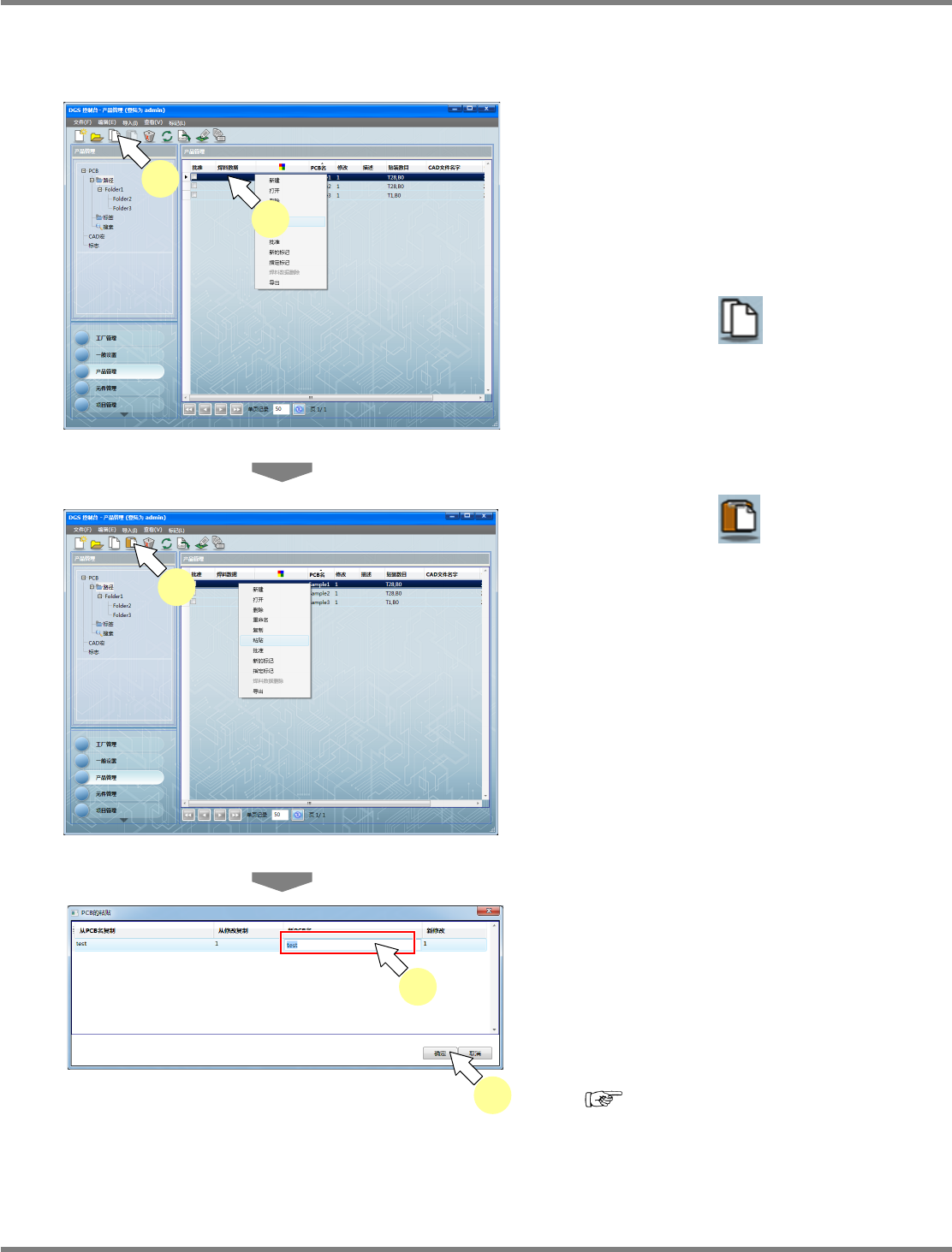 NPM-DGS 程序手册 5.1 概要 Page 5-12 EJS9AC-MB-05P-25 5.1.7 PCB 数据编辑 对登录的 PCB 进行编辑。 1 在 PCB 一览中选择想打开的 PCB 。 2 选择工具栏的 ( 打开 ) , 或者菜单 栏的 [ 文件 ] [ 打开 ] ,或者在右击菜单 中选择 [ 打开 ] 。 显示出 < 产品编辑器 > 画面。 3 对要编辑的地方进行必要的设定。 4 选择工具栏的 ( …