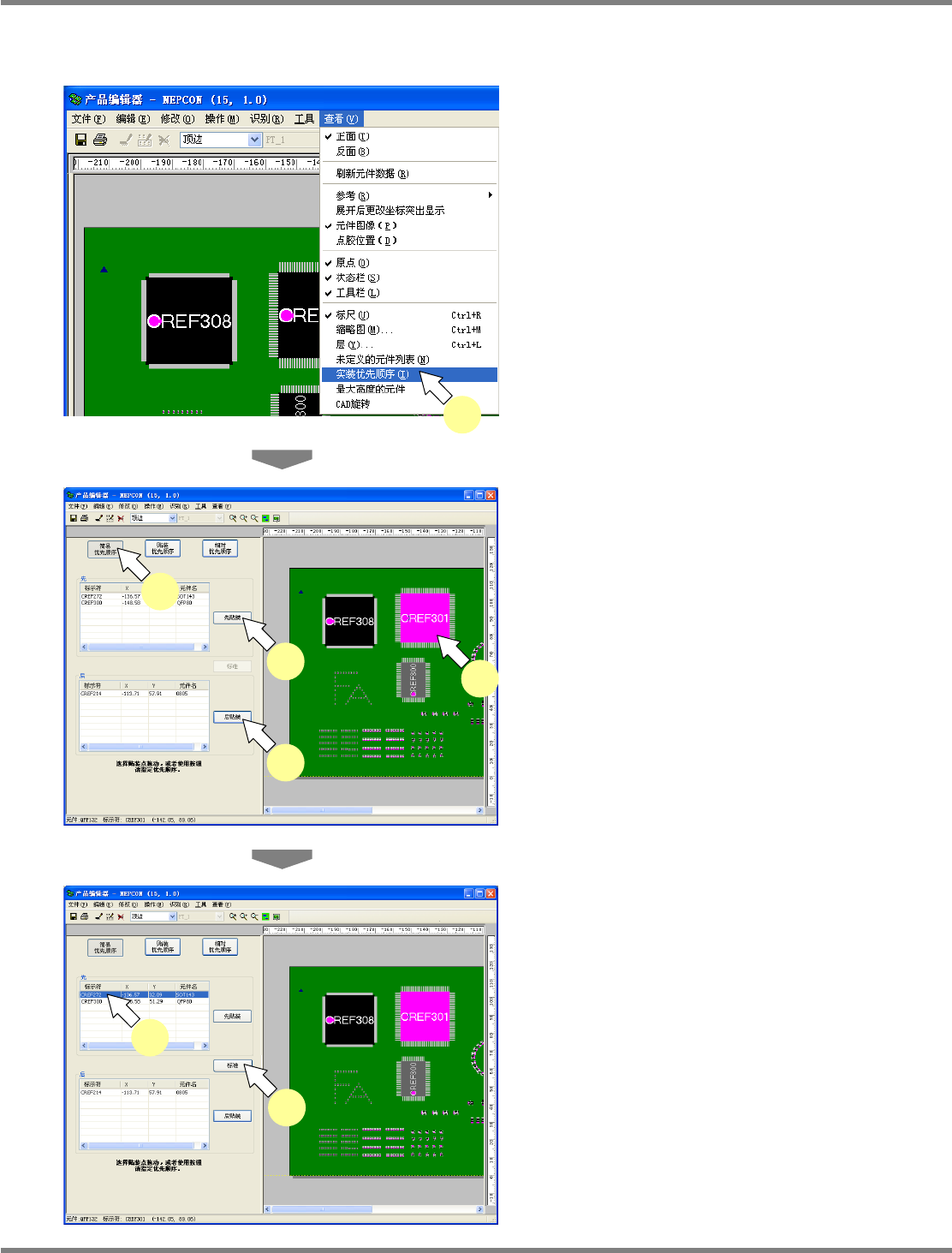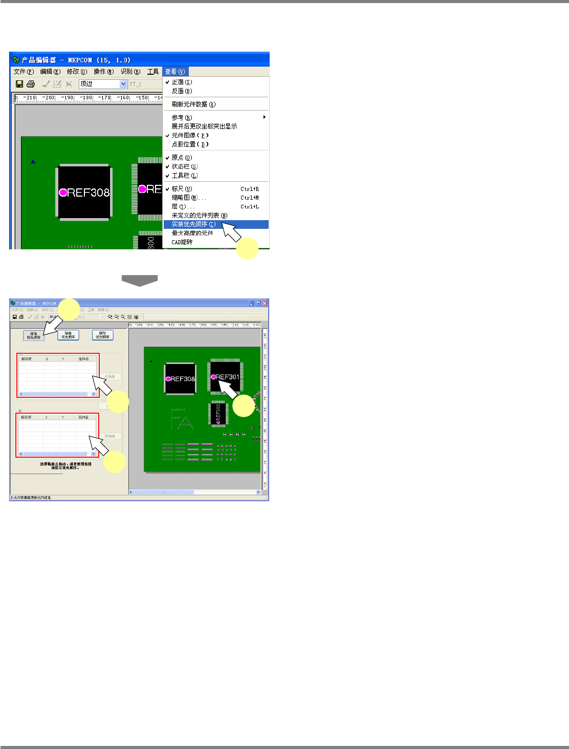 NPM-DGS 程序手册 5.8 PCB 编辑 EJS9AC-MB-05P-25 Page 5-315 简易优先顺序的编辑 1 选择菜单栏的 [ 查看 ] [ 实装优先顺 序 ] 。 显示出实装优先顺序画面。 上次使用时如果在显示画面的状态下 保存 PCB 编辑器, 即使不选择 [ 实装优先顺序 ] , 也会自动 显示出来。 2 点击 [ 简易优先顺序 ] 。 3 在 PCB 编辑器上选择要添加的元件。 如果不把元件…