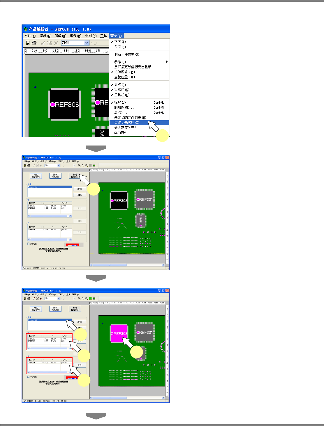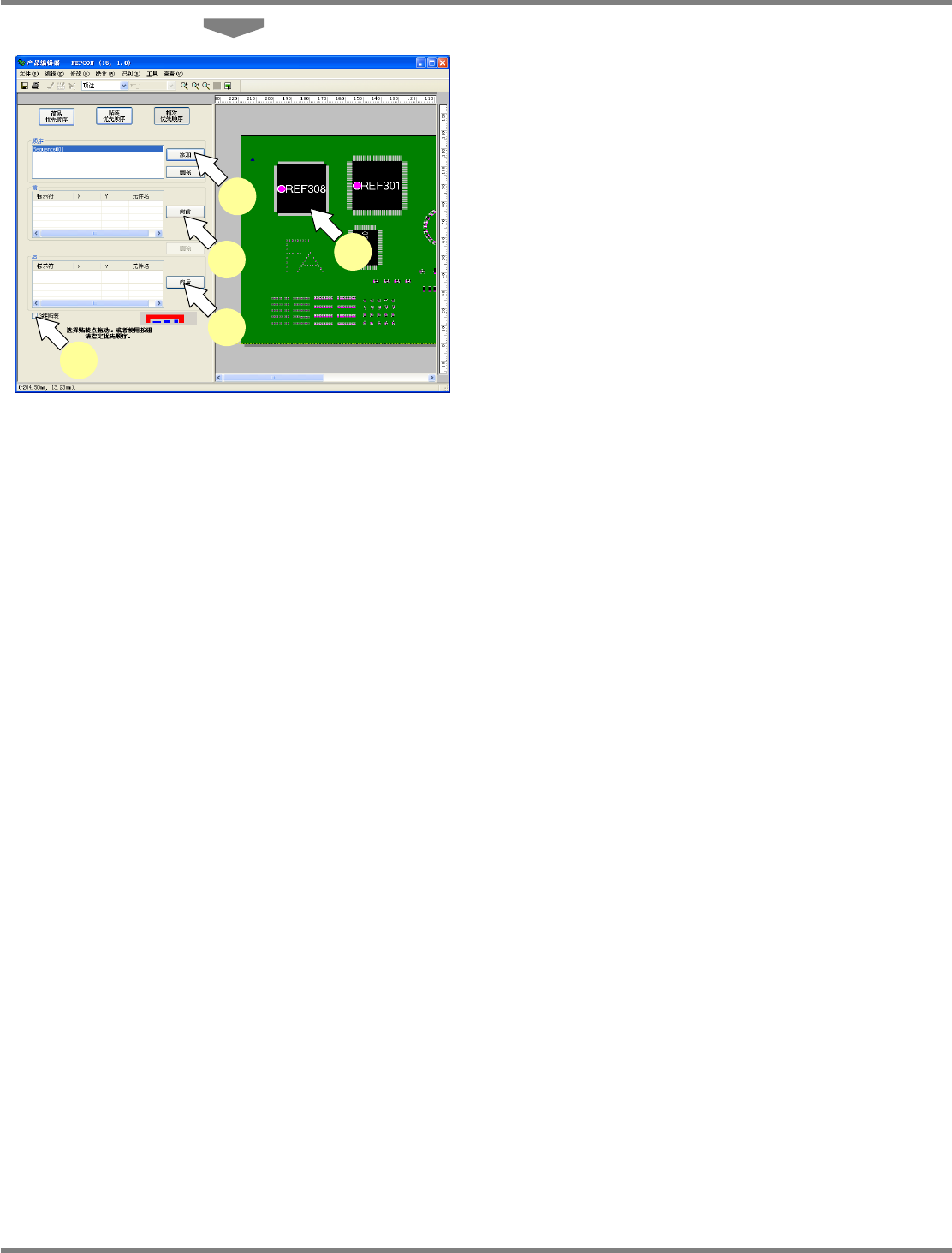 NPM-DGS 程序手册 5.8 PCB 编辑 Page 5-328 EJS9AC-MB-05P-25 3 点击 [ 添加 ] 。 4 在 PCB 编辑器上,选择要指定优先顺 序的元件。 5 将所选择的元件拖放到先装表 / 后装表 中,或者点击 [ 向前 ]/[ 向后 ] ,添加到一 览表中。 所选元件图像从 PCB 编辑器上消失, 并被添加 到表中。 6 选择 ‘3 维贴装 ’ 。 选择 3D 实装,则可实装到同一个坐标上 。…