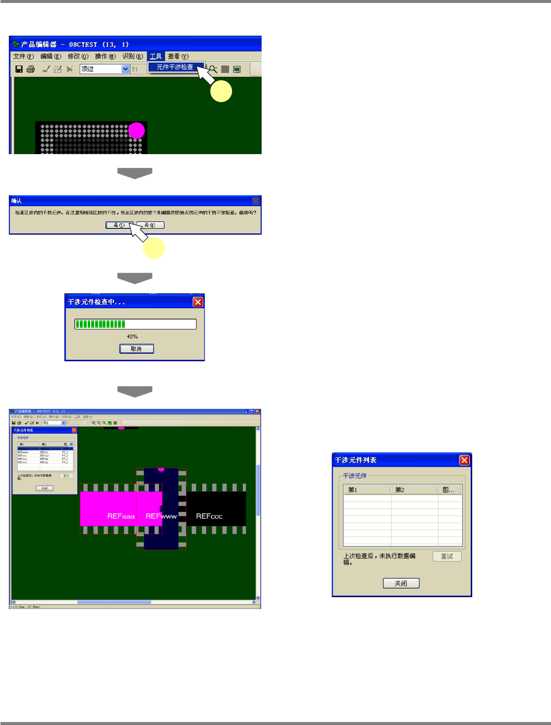 NPM-DGS 程序手册 5.8 PCB 编辑 EJS9AC-MB-05P-25 Page 5-333 5.8.12 元件干涉检查 元件干涉检查 可对基板上的所有实装点确认是否发 生元件干涉。 若有干渉的元件,请在编辑器上进行 修正。 干涉检查仅对特定区块内的元件进行。 不进行检查的情况如下 : 跨越多个区块的实装点的干涉 ; 仅 对所选择的区块的实装点加以编辑 ; 以相对序列指定并且进行 3D 实装的实装点。 设定项目 项目 …