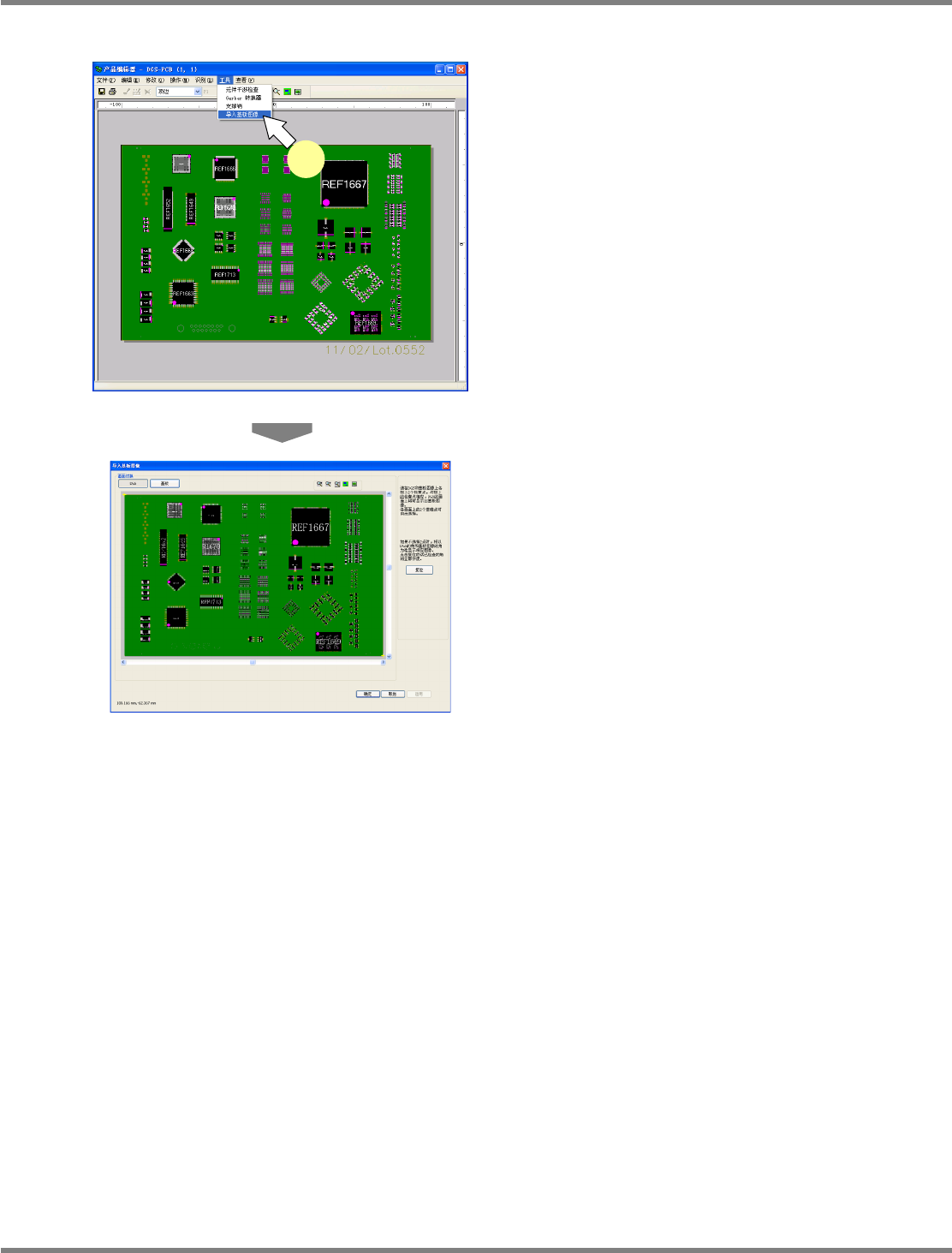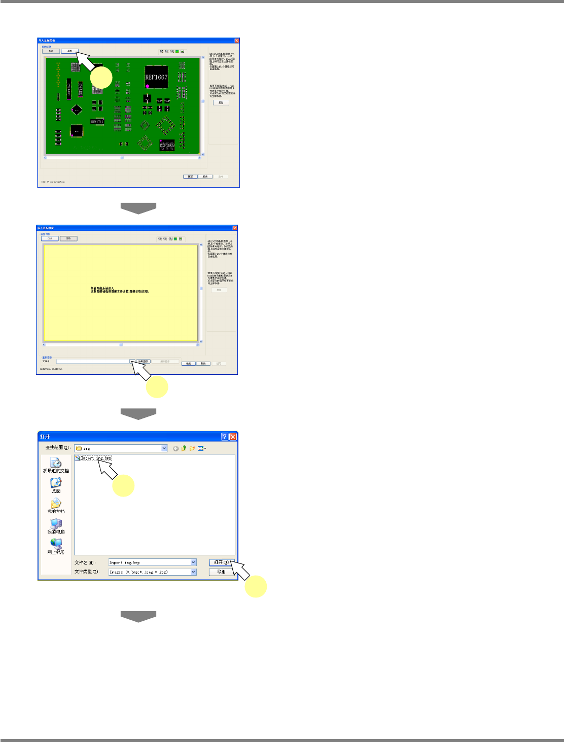 NPM-DGS 程序手册 5.8 PCB 编辑 Page 5-344 EJS9AC-MB-05P-25 ② 基板图像的指定 1 点击 ‘ 画面切换 ’ 的 [ 基板 ] 。 没有基板图像的基板,将在基板面上 只显示读 取基板图像的导航。 2 点击 [ ・・・ ] 。 显示出 < 打开文件 > 画面。 3 选择基板图像。 可用于基板图像的扩展名如下所示。 .bmp 、 .jpg 、 .jpeg 4 点击…