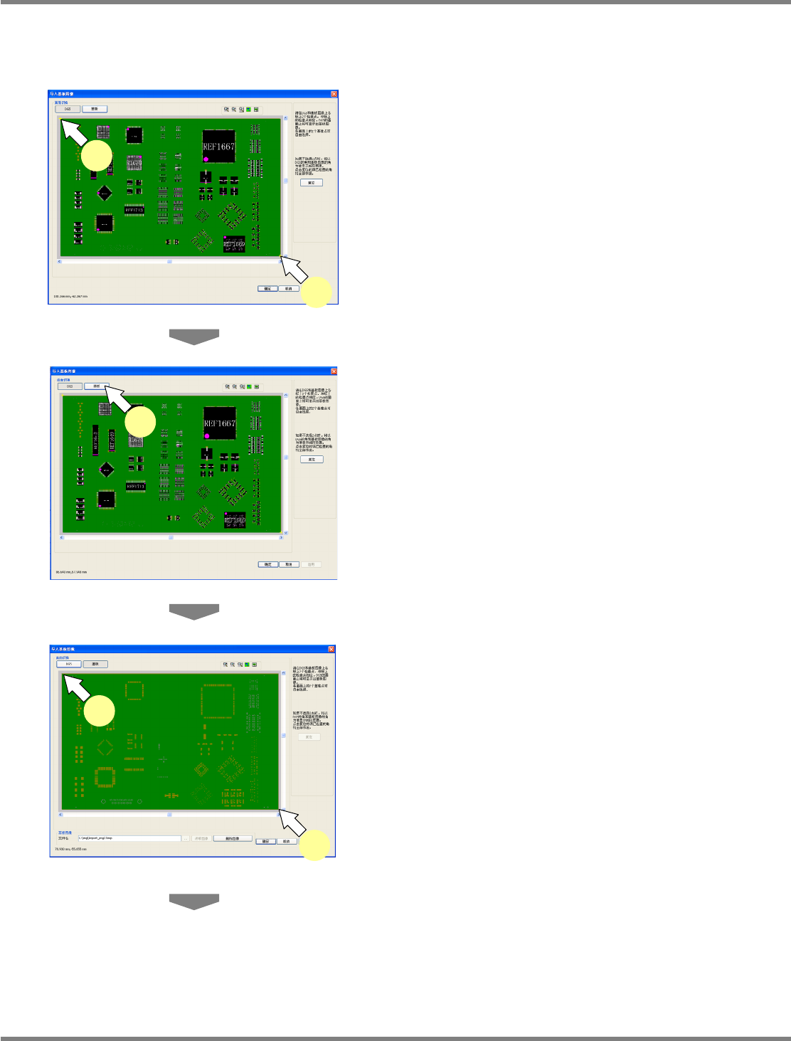 NPM-DGS 程序手册 5.8 PCB 编辑 Page 5-346 EJS9AC-MB-05P-25 ③ 在 PCB 编辑器上显示基板图像 导入基板图像后, DGS 画面的基板与基板图像的角将重叠显示 。 在 < 导入基板图像 > 画面下,通过设定基准点,可对基 板图像的显示进行调整。 1 点击基板上的两个角。 将在点击过的部位上显示 + 标记。 2 点击 ‘ 画面切换 ’ 的 [ 基板 ] 。 3 点击基板图像上的两…
