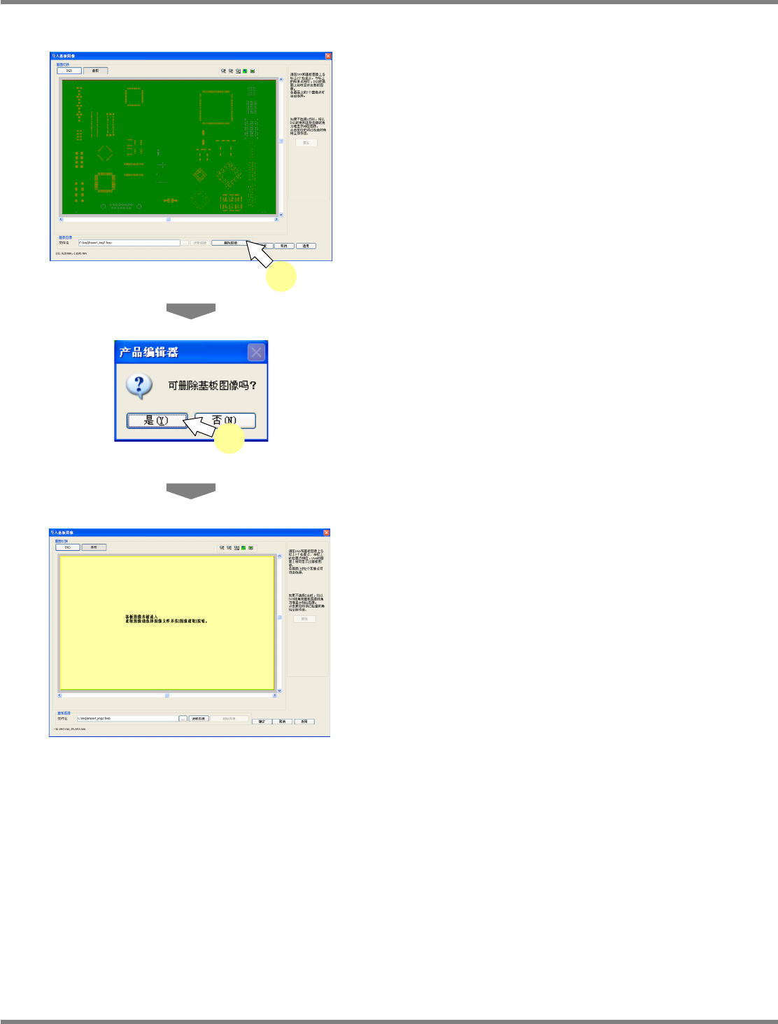 NPM-DGS 程序手册 5.8 PCB 编辑 Page 5-348 EJS9AC-MB-05P-25 ④ 删除基板图像 1 点击 [ 删除图像 ] 。 显示出确认删除的信息。 2 点击 [ 是 ] 。 基板图像被删除。 Project050816S-1 4C00 2 Project050816S-1 5C00 Project050816S-1 3C00 1