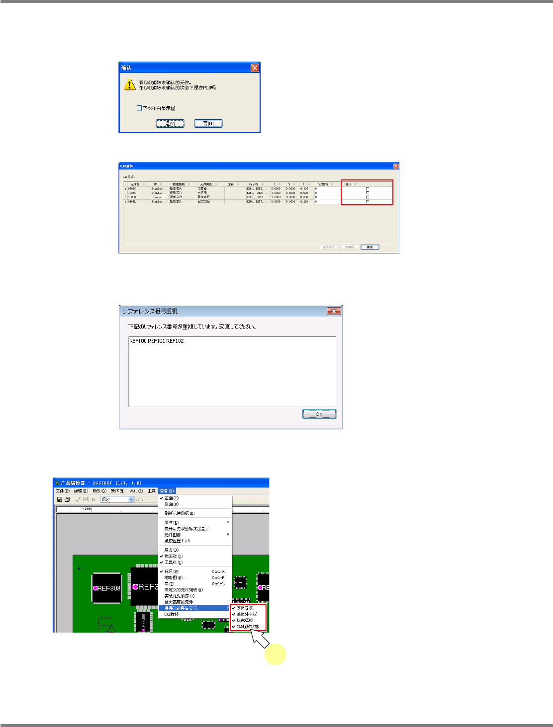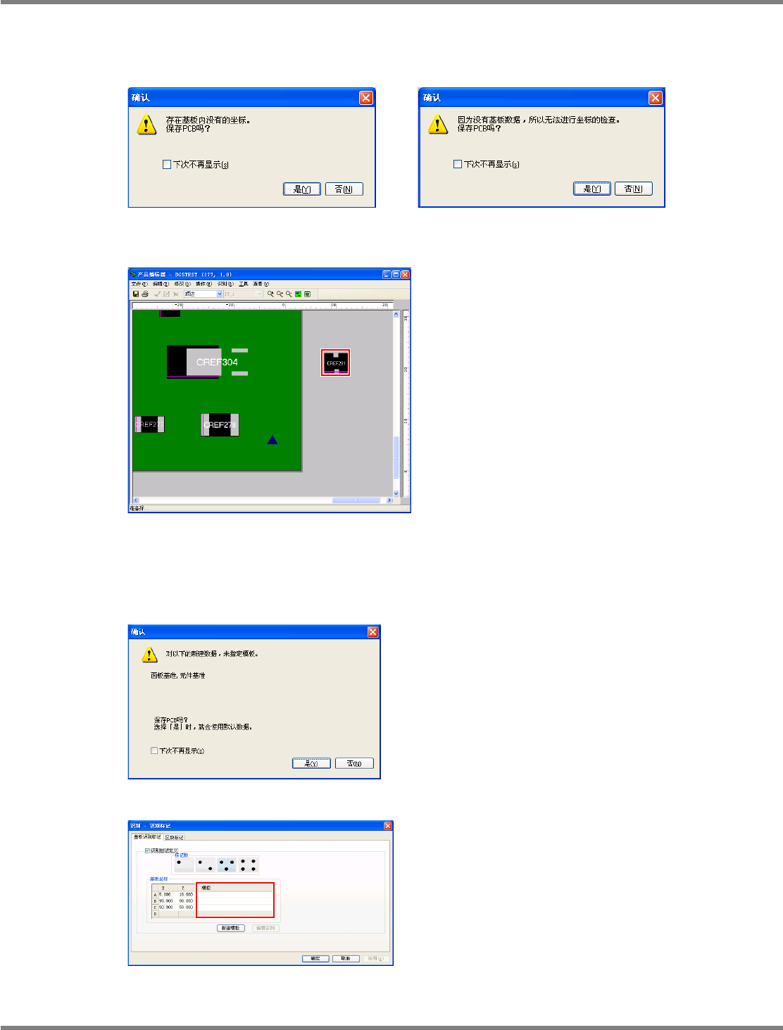 NPM-DGS 程序手册 5.8 PCB 编辑 Page 5-350 EJS9AC-MB-05P-25 ② 基板外坐标 当标记位于在基板外形的外侧时,将 针对元件显示警告对话框。 基板外坐标警告对话框 警告时的基板设定 ③ 模板标记 当在 PCB 上使用的模板标记没有位于 DGS 上时,将显示警告对话框。 模板标记警告对话框 警告时的标记设定 Project050817S-0 4C00 Project050817S-0 5C00 ( 不…