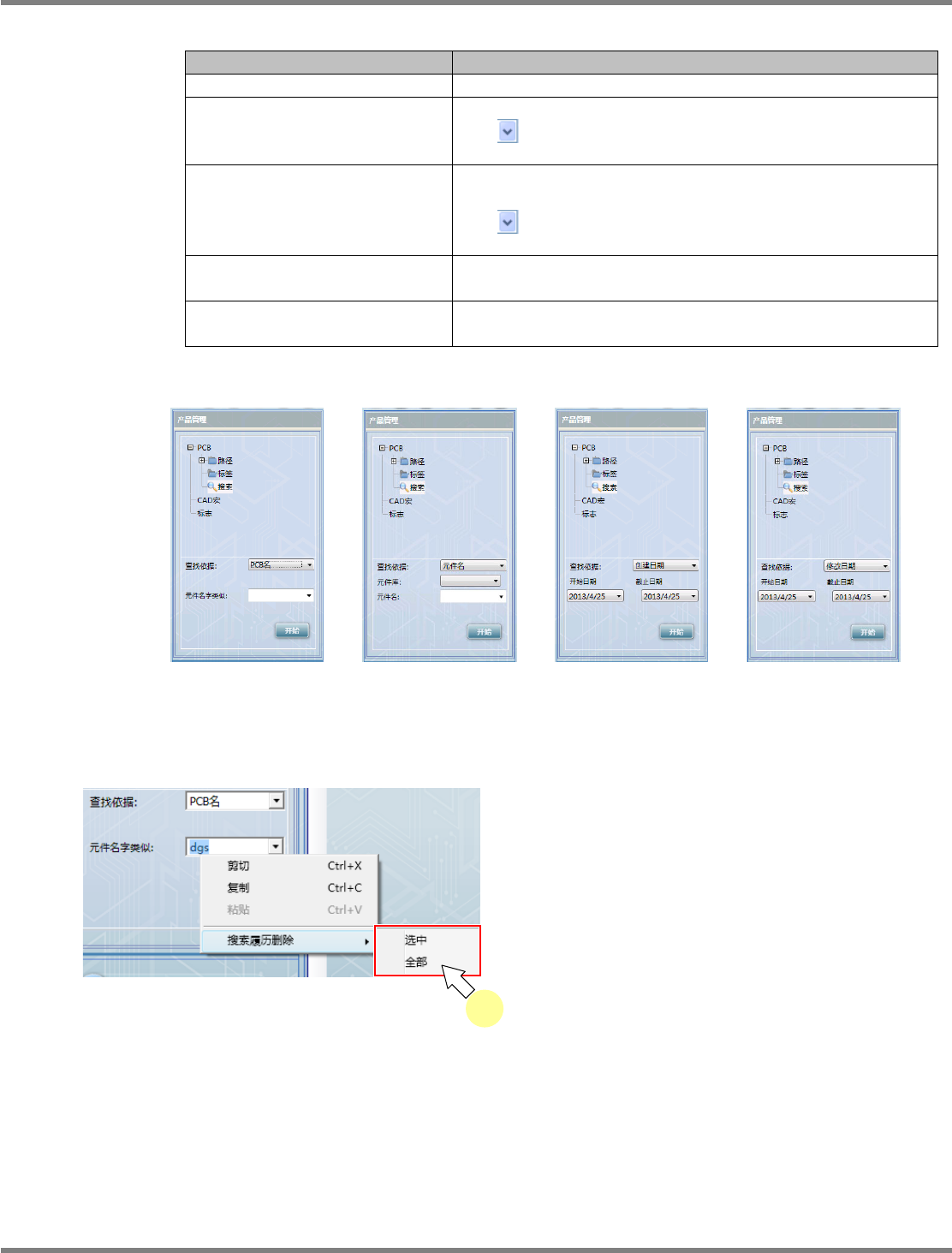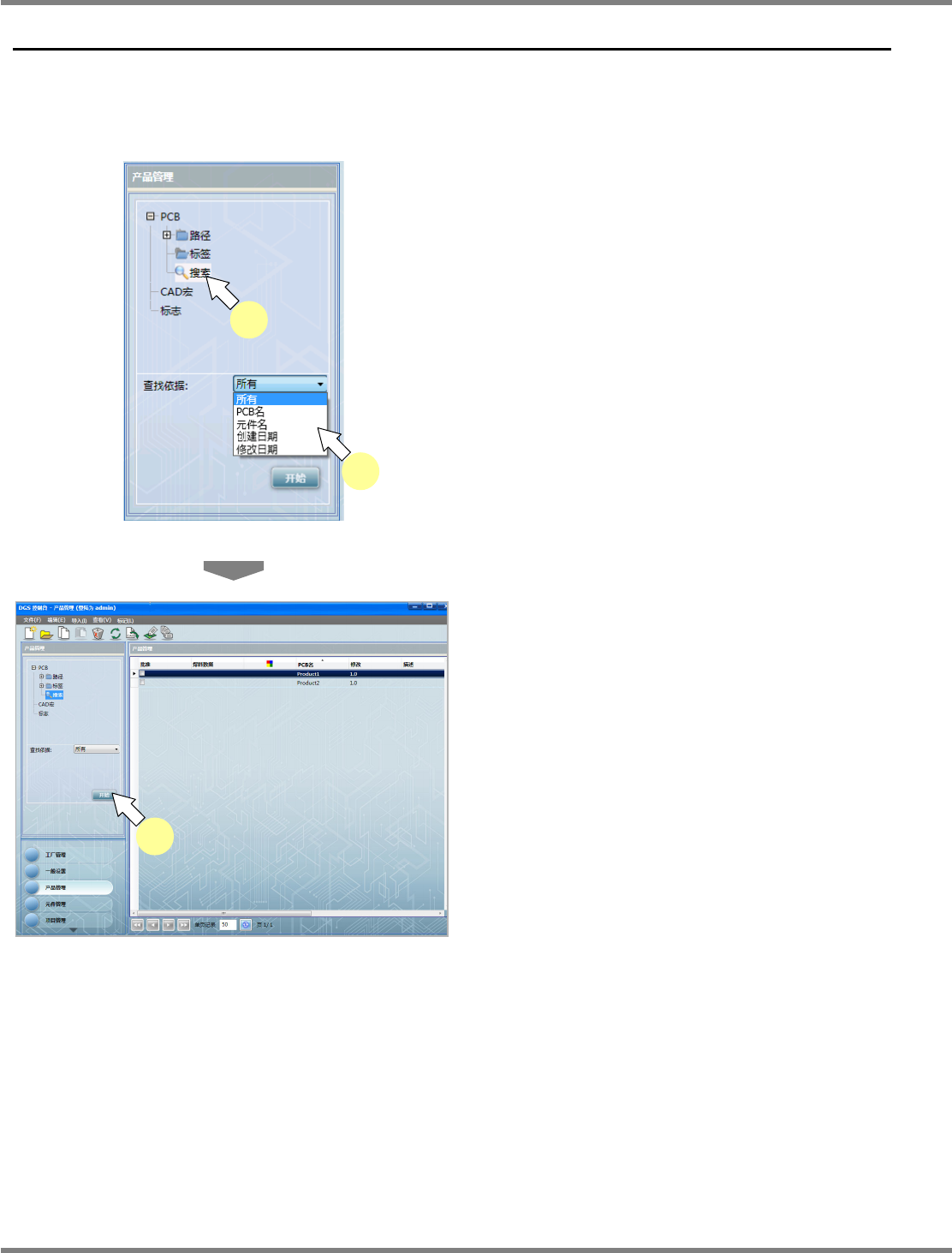 NPM-DGS 程序手册 5.9 PCB 搜索 Page 5-364 EJS9AC-MB-05P-25 5.9 PCB 搜索 5.9.1 搜索 搜索 PCB ,并在 PCB 一览表中仅显示所搜索的 PCB 。 1 选择 [ 搜索 ] 。 2 选择搜索方法。 搜索方法有 [ 所有 ] 、 [PCB 名 ] 、 [ 元件名 ] 、 [ 创建 日期 ] 、 [ 修改日期 ] 。 3 点击 [ 开始 ] 。 实行搜索后,所搜索的 PCB…