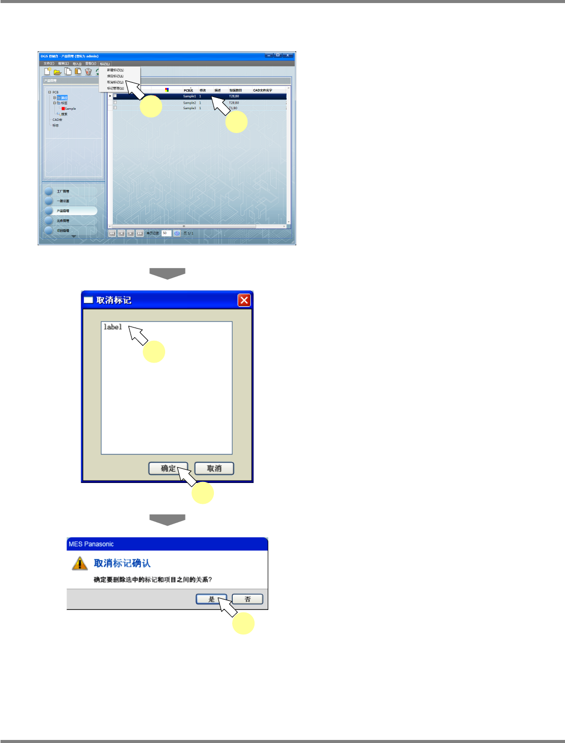 NPM-DGS 程序手册 5.9 PCB 搜索 EJS9AC-MB-05P-25 Page 5-369 取下标签 1 在 PCB 一览表中选择要取下标签的 PCB 。 2 选择菜单栏的 [ 标记 ] [ 取消标记 ] 。 显示出 < 取消标记 > 画面。 3 选择标签。 4 点击 [ 确定 ] 。 显示出确认对话框。 5 点击 [ 是 ] 。 在 PCB 上取下标签。 Project050902S-0 9…