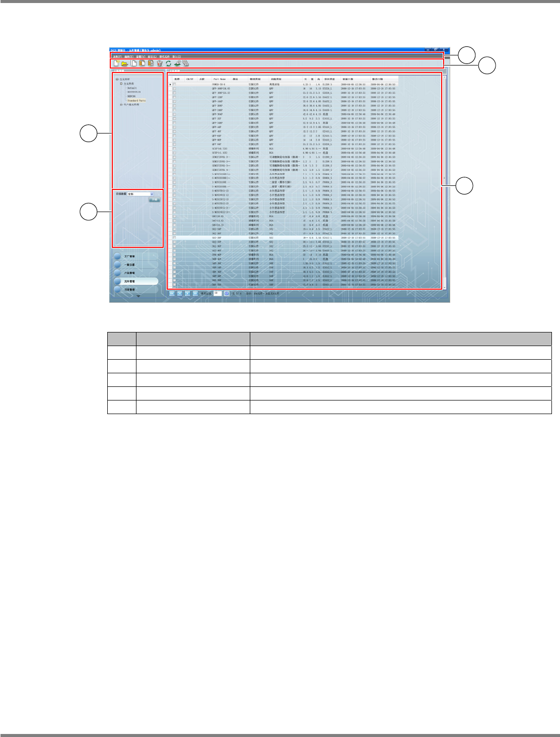 NPM-DGS 程序手册 6.1 概要 EJS9AC-MB-06P-24 Page 6-3 6.1.2 元件一览画面组成 No. 名称 说明 菜单栏 显示各菜单。 工具栏 显示各操作的图标。 库树形菜单显示区域 显示元件库的树形菜单。 元件一览表检索区域 显示为了检索元件所需的项目。 元件一览表显示区域 显示元件数据一览表。 Parts060102S-0 1C01 2 3 2 1 2 2 2 5 2 4