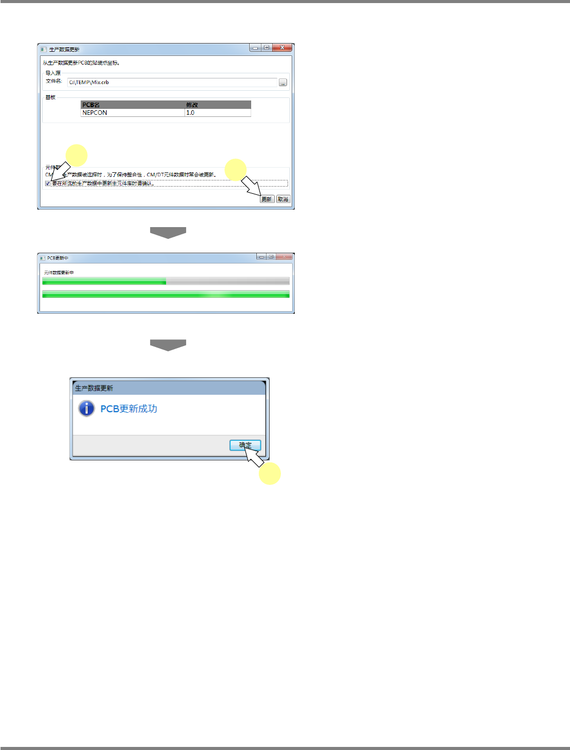 NPM-DGS 程序手册 5.1 概要 EJS9AC-MB-05P-25 Page 5-23 NPM 生产数据的更新 在 NPM 生产数据下,只可反映通过 NPM 设备变更的元件 / 坐标数据。 6 元件数据也需要更新时, 勾选元件数据 的复选框。 属于 NPM 生产数据时, 元件数据的 CM/DT 设 备固有信息不会被更新。 7 点击 [ 更新 ] 。 在生产数据下分配给了元件, 且设为对象外时, 也不会反映坐标、元件数据…