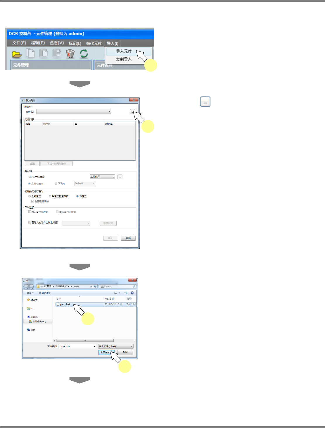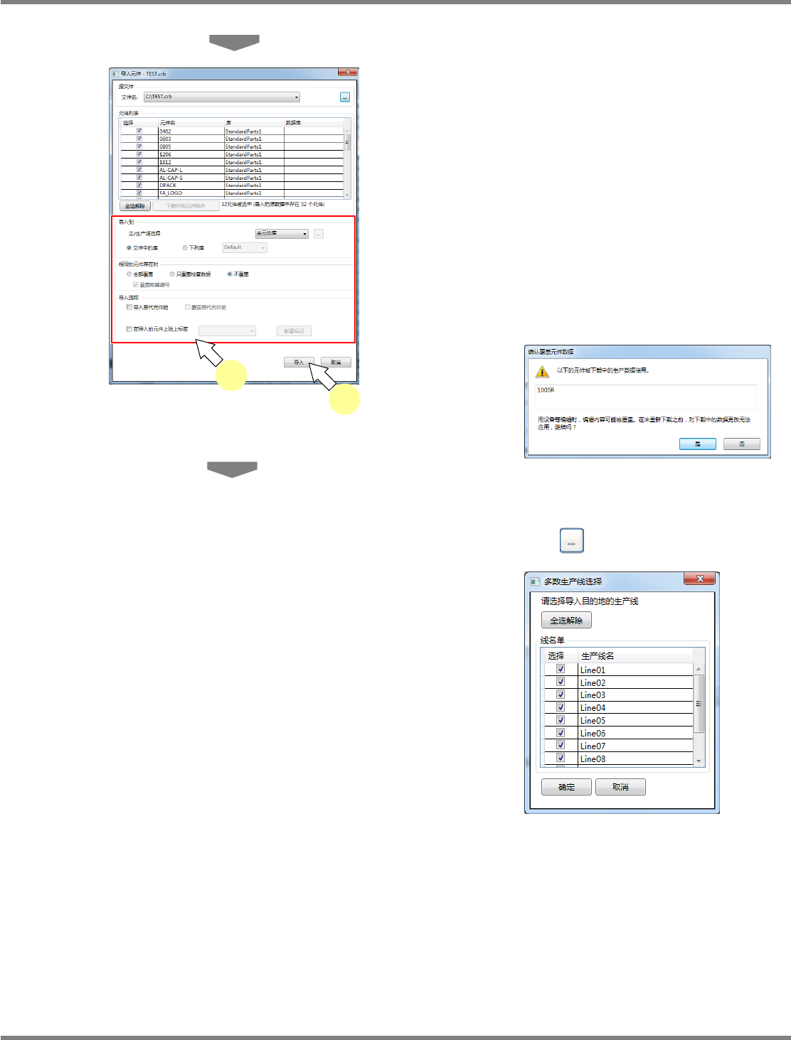NPM-DGS 程序手册 6.4 元件的导入、导出 EJS9AC-MB-06P-24 Page 6-43 5 选择导入目的地。 导入目的地可从主元件库与生产线元 件库中选 择。 ■ 主元件库 1. 在主 / 生产线选择下选择主元件库。 2. 如果生产数据内的元件库没有问题, 请选 择 ' 文件中的库 '; 指定任意的元件库, 请选 择 ' 下列库 ' 。 ■ 生产线元件库 1. 从主 / 生产…
