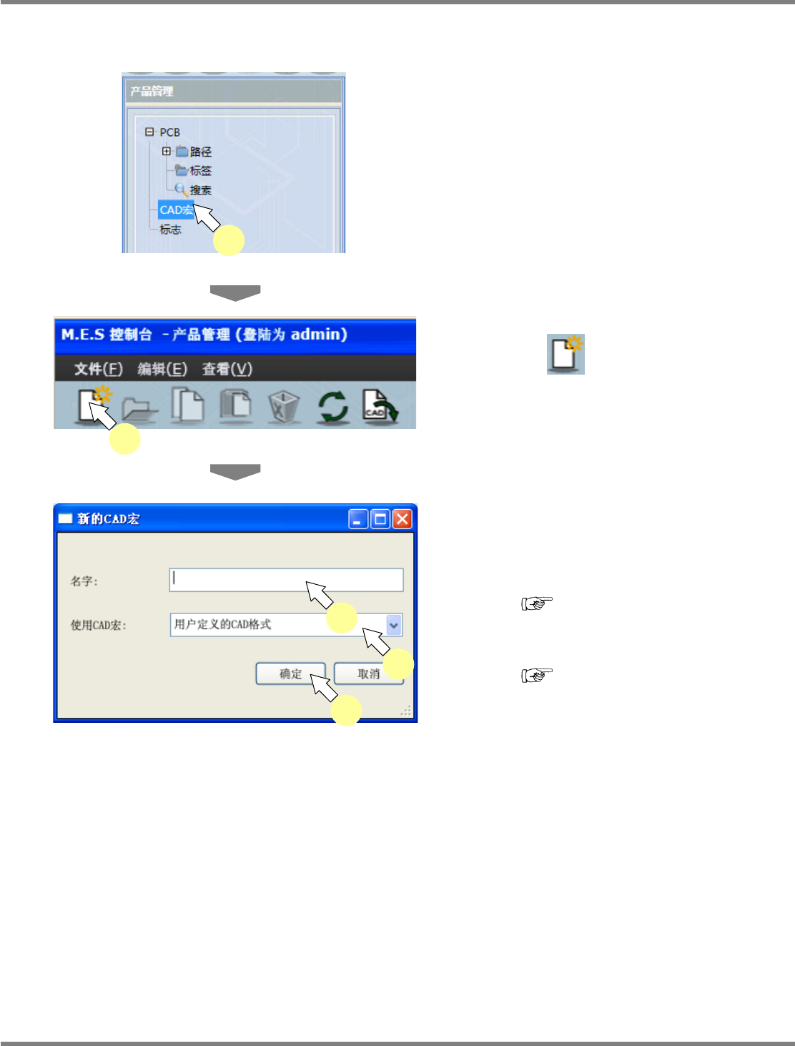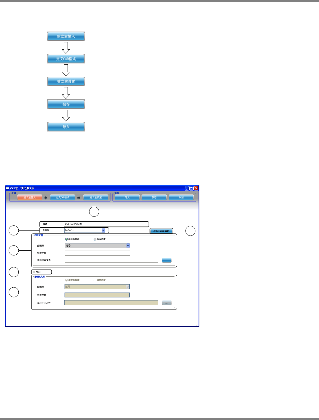 NPM-DGS 程序手册 5.2 CAD 宏的定义 Page 5-28 EJS9AC-MB-05P-25 5.2.1 CAD 宏编辑器 编制、编辑宏时,请按照以下步骤。 ---------- 设定要导入的 CAD/BOM 文件。 ---------- 对 CAD/BOM 文件格式进行定义。 ---------- 对获取 CAD 时的具体设定进行定义。 ---------- 保存所定义的宏文件。 ---------- 使用所定义的宏文件获…
