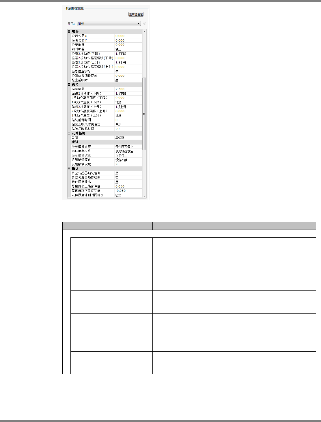NPM-DGS 程序手册 6.5 添加新的元件 Page 6-92 EJS9AC-MB-06P-24 项目 说明 ‘ 吸着 ’ ‘ 吸着 2 段动作高度偏移 ( 上升 )’ 在吸着动作下执行 2 段上升时, 想要比标准快 2 段开始上升之际, 设定这个项目。 ‘ 吸着位置学习 ’ 设定是否进行吸着位置学习和自动调 整。 使用在吸嘴库被设定为吸着位置学 习 ON 的吸嘴进行贴装时变 为有效。 ‘ 吸附位置偏移容差 ’ 吸附位置偏移量的…