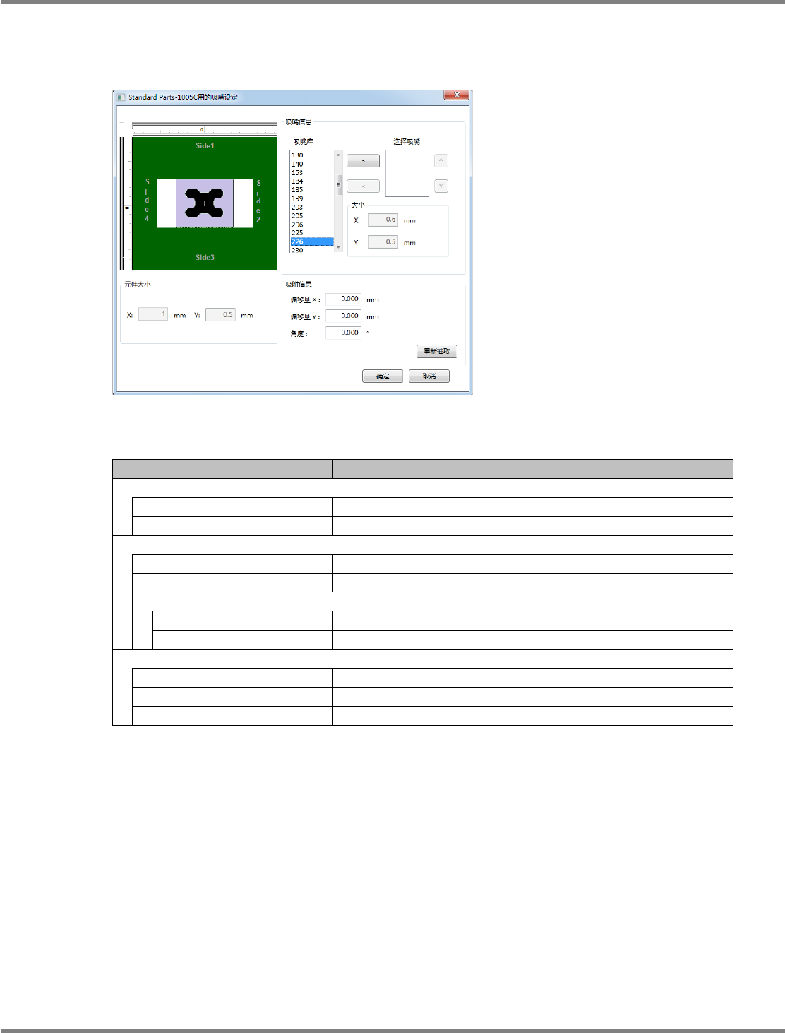 NPM-DGS 程序手册 6.5 添加新的元件 EJS9AC-MB-06P-24 Page 6-117 按钮 按钮 说明 ‘ 吸嘴信息 ’ 向右箭头 把在 ‘ 吸嘴库 ’ 中选择的吸嘴作为候选。 向左箭头 解除所选择的吸嘴。 向上箭头 将候选吸嘴的顺序向上推移。 向下箭头 将候选吸嘴的顺序向下推移。 ‘ 吸附信息 ’ [ 重新抽取 ] 重新显示吸附位置的图像。 [ 确定 ] 保存所设定的数据,结束吸嘴检查。 [ 取消 ] 不保存所设…