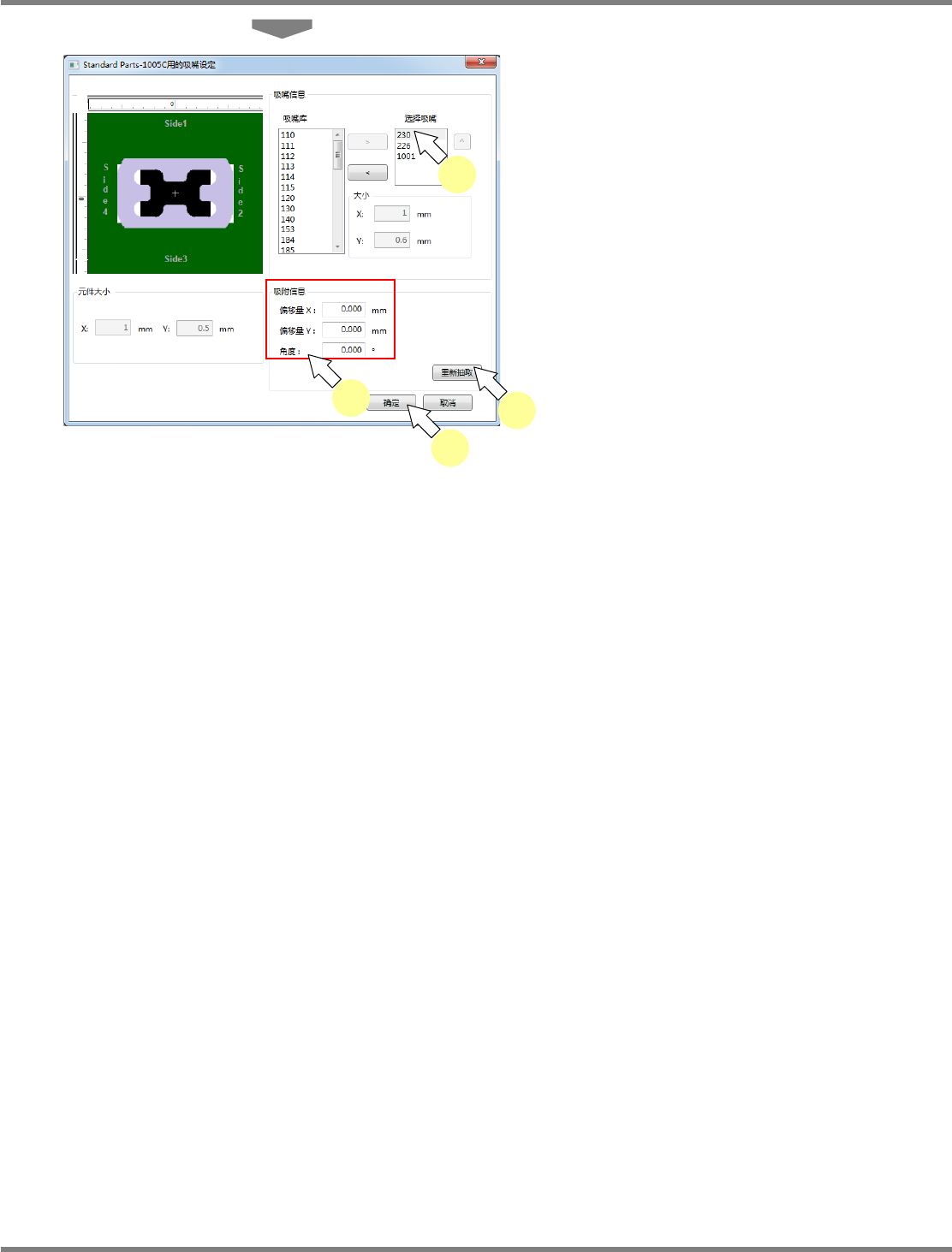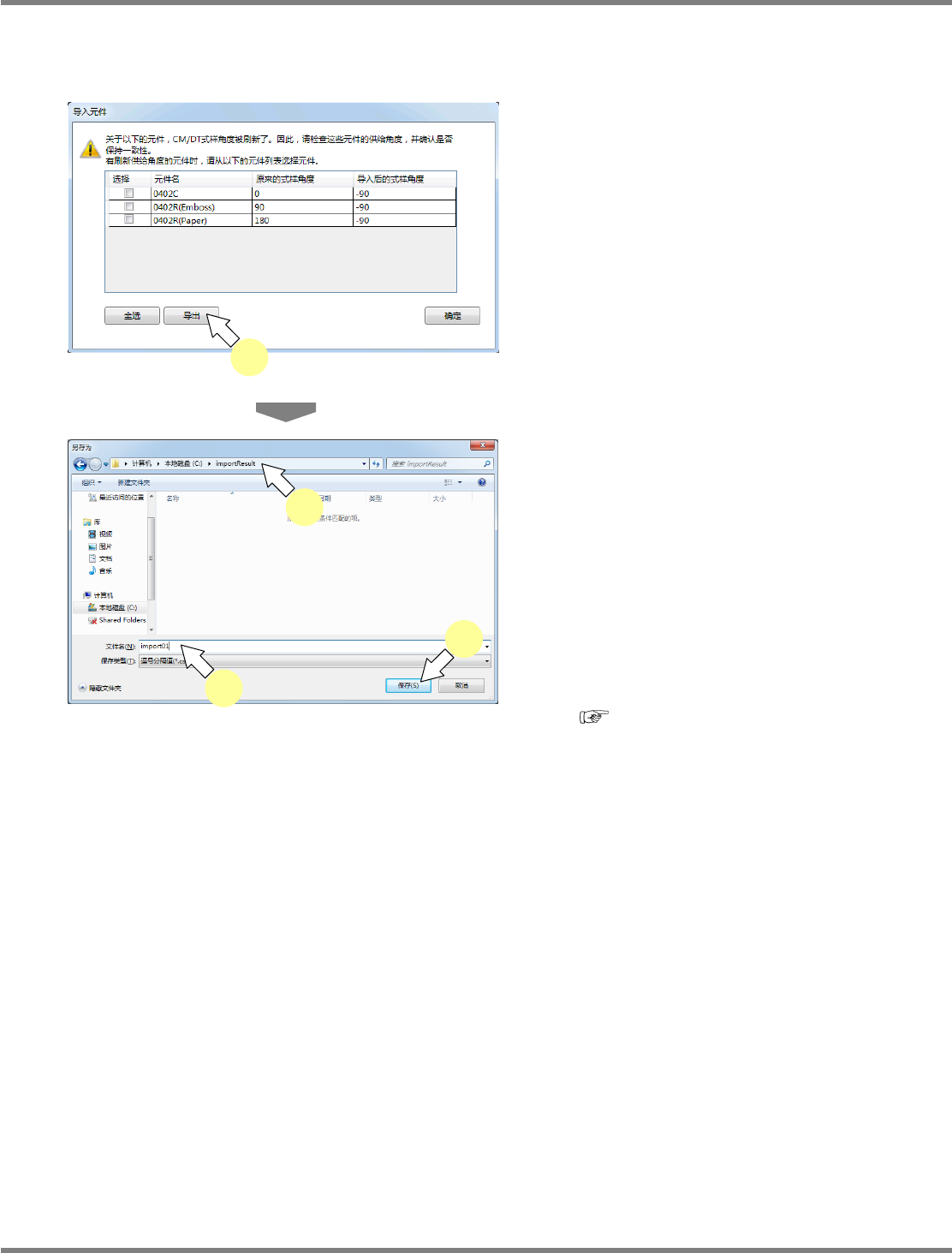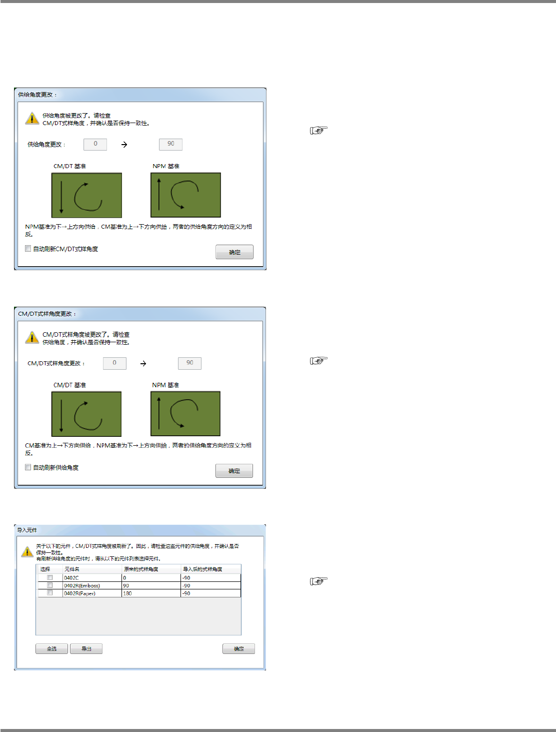 NPM-DGS 程序手册 6.5 添加新的元件 Page 6-120 EJS9AC-MB-06P-24 供给角度 /CM 式样角度更改时的确认对话框 当变更了供给角度 /CM 设备固有信息的式样角度时,或者导入了 拥有 CM 设备固有信息的元件数 据时,将显示以下画面。 ① 更改了供给角度时的确认对 话框 将显示更改到左侧前的角度、更改到 右侧后的 角度。当需要自动更改式样角度时, 请勾选 ‘ 自 动刷新 CM/DT 式样角度 …