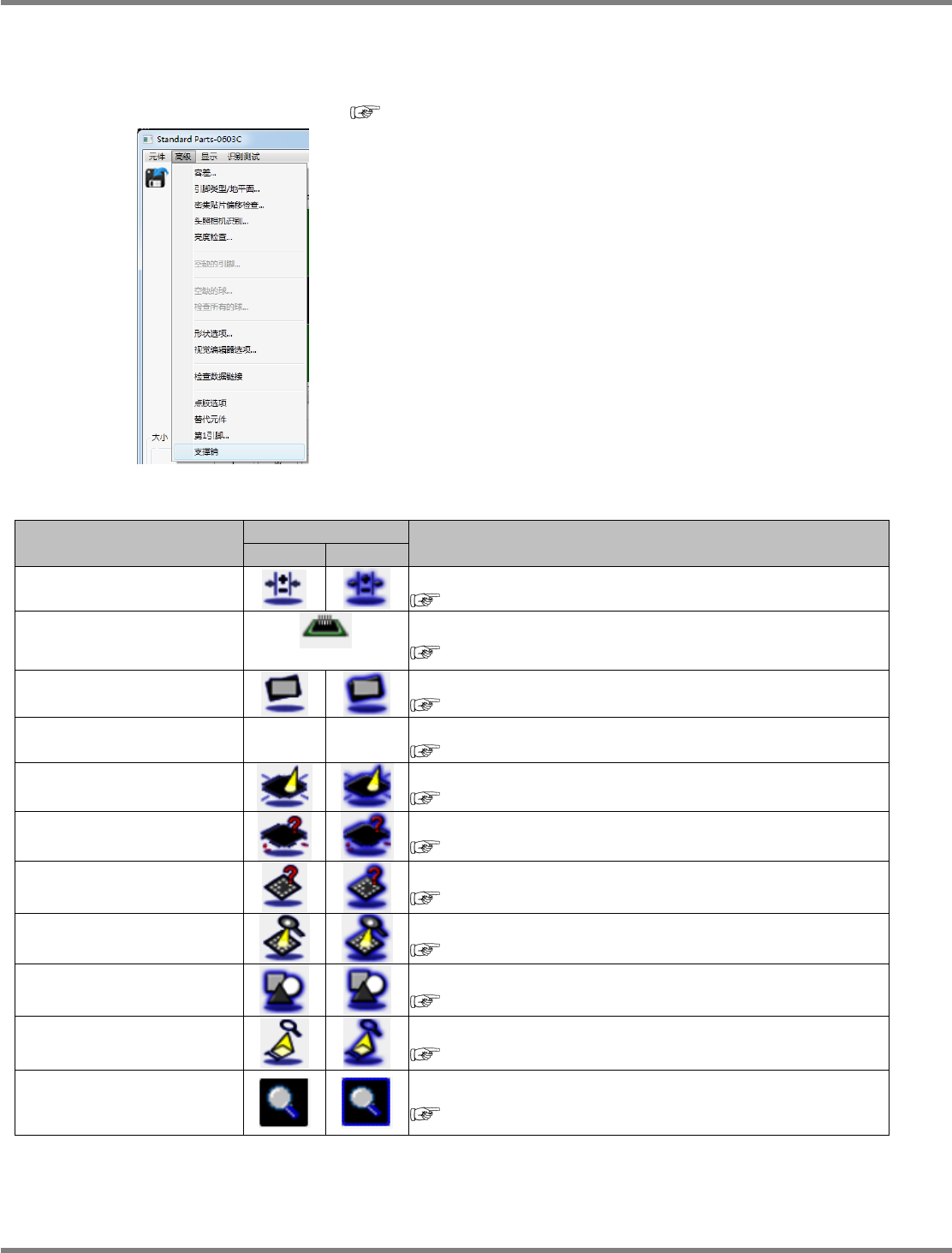 NPM-DGS 程序手册 6.5 添加新的元件 EJS9AC-MB-06P-24 Page 6-123 菜单项目 工具栏 说明 初期显示 编辑后 [ 点胶选项 ] 设定点胶选项数据。 ‘6.5.5 点胶选项数据 ’ [ 替代元件 ] 设定替代元件。 ‘6.8 代替元件的设定 ’ [ 第 1 引脚 ...] ― ― 设定第 1 引脚的位置。 ‘6.5.8 第 1 引脚设定 ’ [ 支撑销 ] ― ― 对元件设定支撑销。 ‘6.5.9 支撑…