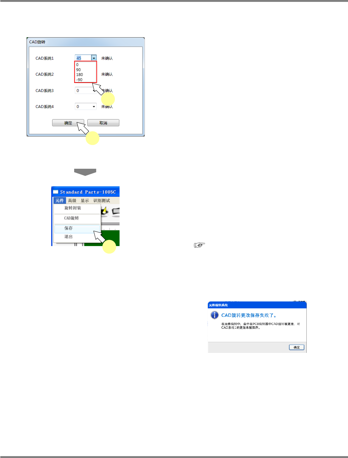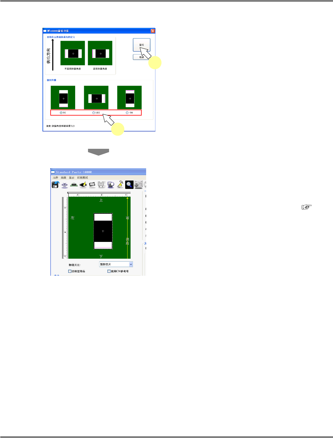 NPM-DGS 程序手册 6.5 添加新的元件 EJS9AC-MB-06P-24 Page 6-125 旋转封装 1 选择旋转角度。 2 点击 [ 旋转 ] 。 显示出旋转后的元件。 ( 左图为选择了 ‘90’ 的情 形 ) 封装旋转的角度不会反映进贴装角度 。请在封 装旋转后再次确认基板。 需要变更元件的贴装角度时,请参照 ‘5.8.3 添加实装点 ’ 。 Parts060603S-3 5C01 2 1 Parts0606…