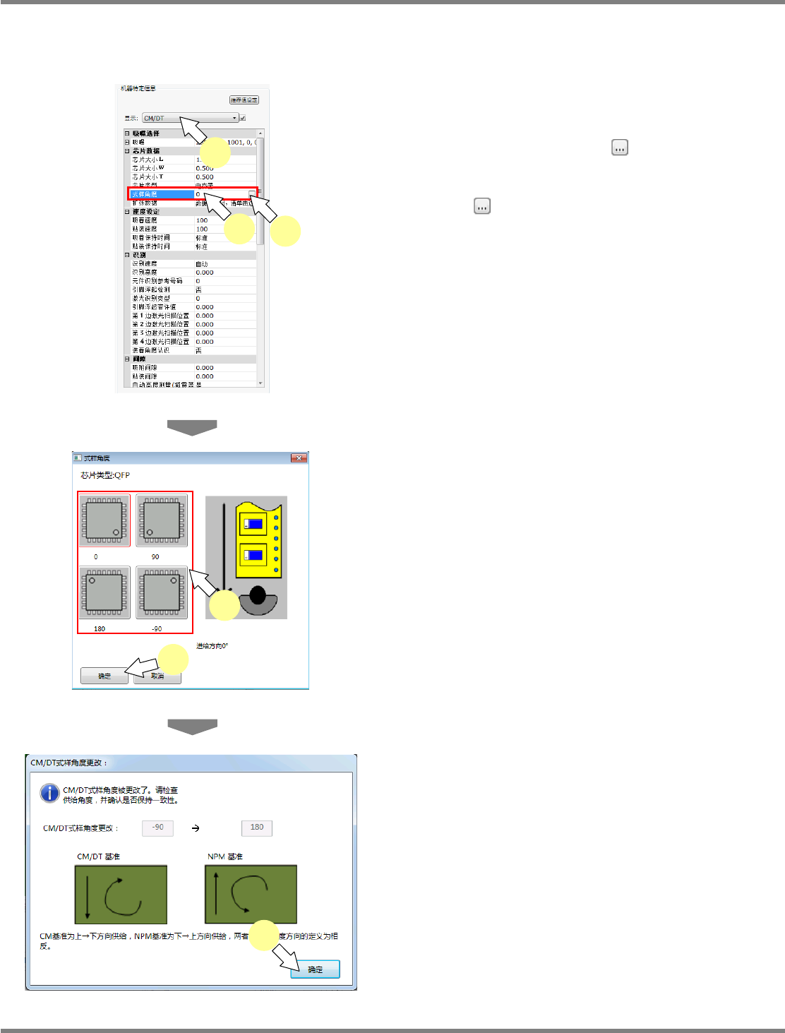 NPM-DGS 程序手册 6.5 添加新的元件 Page 6-148 EJS9AC-MB-06P-24 6.5.6 编辑 CM 式样角度 编辑 CM 用元件的式样角度。 1 在 ‘ 机器特定信息 ’ 下选择 ‘CM/DT’ 。 2 或者点击 ‘ 式样角度 ’ 的 , 或者在式样 角度的数值部分直接输入。 点击 ,即显示 < 式样角度 > 画面。 当直接输入了式样角度时,请跳至步 骤 4 。 3 选择任意角度后,点击 …