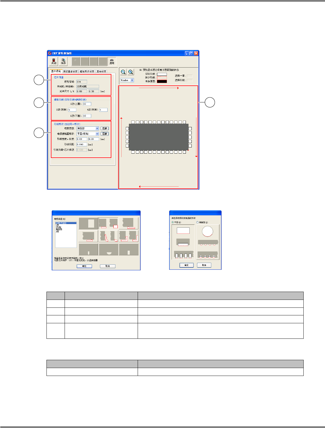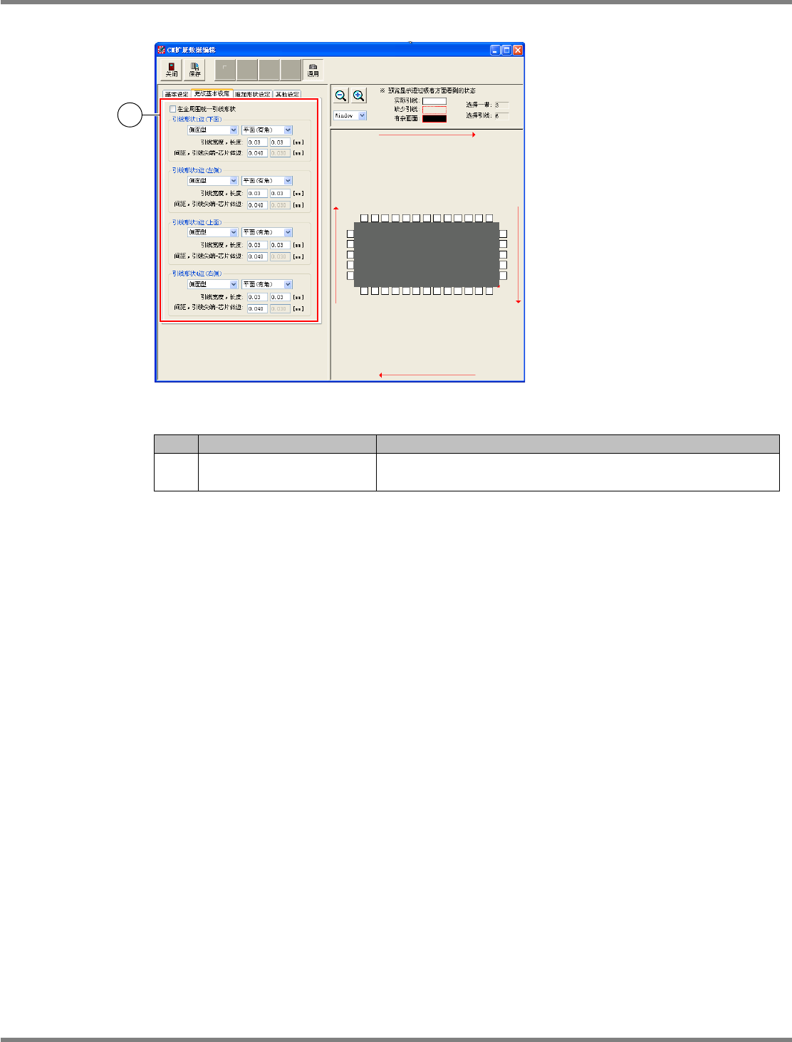 NPM-DGS 程序手册 6.5 添加新的元件 EJS9AC-MB-06P-24 Page 6-155 [ 更改基本设定 ] 标签 设定项目 No. 名称 说明 1 引线形状 对每个边进行基本设定。进行设定时 ,请不要勾选 ‘ 在全周围同 一引线形状 ’ 的复选框。 Parts060506S-1 1C00 1