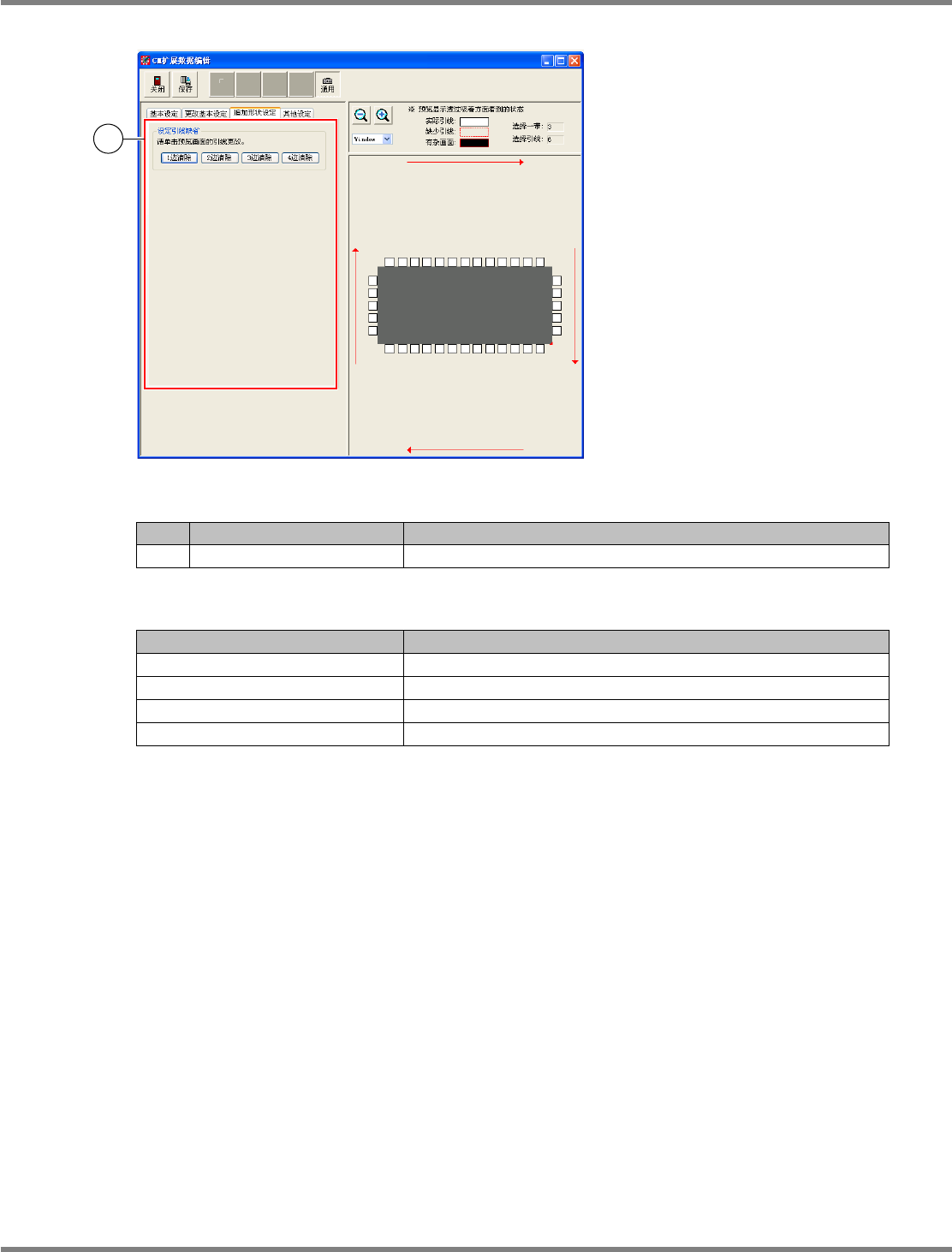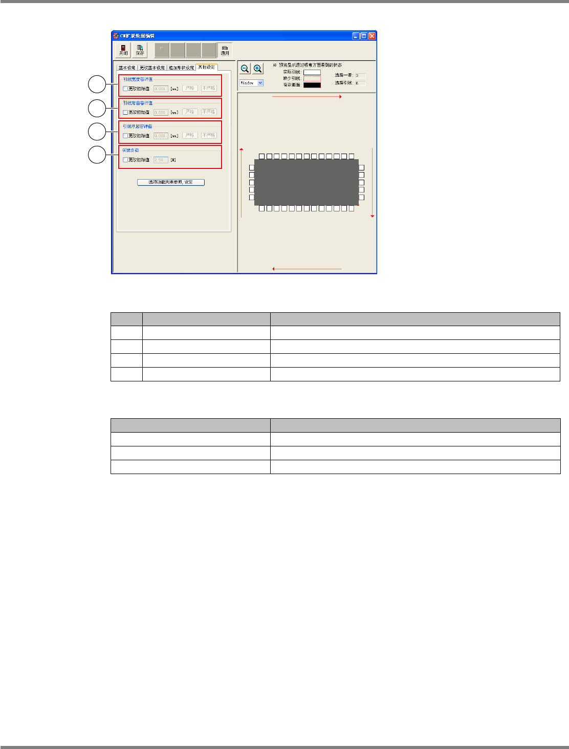 NPM-DGS 程序手册 6.5 添加新的元件 EJS9AC-MB-06P-24 Page 6-157 [ 其他设定 ] 标签 设定项目 No. 名称 说明 1 ‘ 引线宽度容许值 ’ 可输入引线宽度容许值,或者设定 [ 严格 ] 或 [ 不严格 ] 。 2 ‘ 引线弯曲容许值 ’ 可输入引线弯曲的容许值,或者设定 [ 严格 ] 或 [ 不严格 ] 。 3 ‘ 引线浮起容许值 ’ 可输入引线浮起的容许值,或者设定 [ 严格 ] …